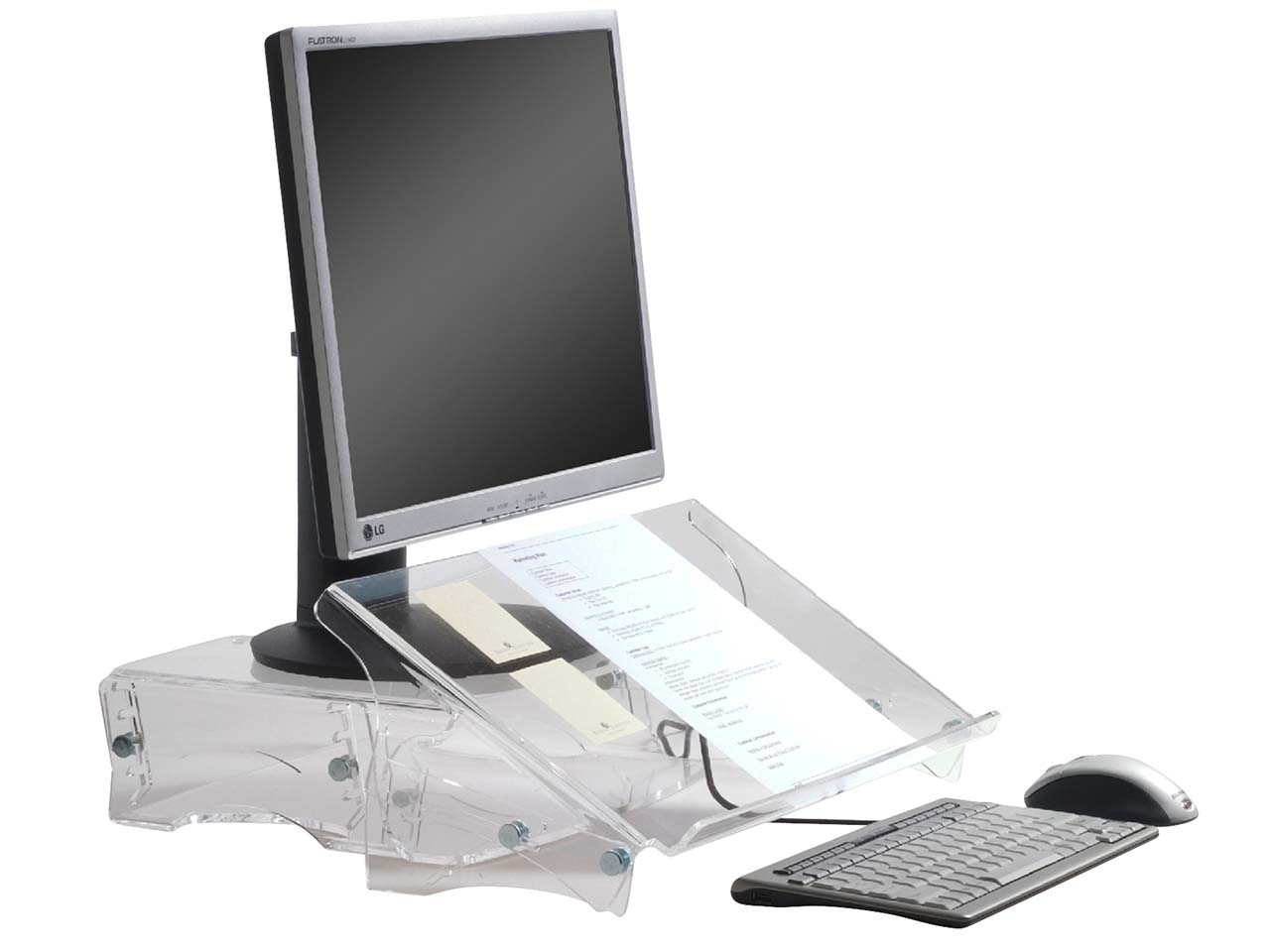 Dieser hochwertige Dokumentenhalter von Bakker Elkhuizen besteht aus recyceltem Acryl und ermöglicht es, Dokumente oder mobile Geräte in einer Linie zwischen Monitor und Tastatur abzulegen. Dadurch entsteht ein ergonomischeres Arbeiten, denn Nacken und Rücken müssen zur Betrachtung von Notizen, Büchern, etc. nicht erst zur Seite gedreht werden. Nackenmuskulatur und Augen werden durch die Nutzung des ergonomischen Accessoires merklich entlastet. Die Höhe des Dokumentenhalters ist dabei in sieben Stufen zwischen 120 und 240 mm verstellbar. So entstehen Betrachtungswinkel zwischen 12° und 46°. Durch die große Ablagefläche kann das Hilfsmittel sogar für Ordner oder Bücher im Format DIN A3 genutzt werden. Das strapazierfähige Material ermöglicht eine Tragkraft von bis zu 10 kg. Mit dem Dokumentenhalter ist es möglich, den Bildschirm und Dokumente in Papierform komfortable gleichzeitig zu nutzen. Praktisch: Bei Nichtgebrauch findet die Tastatur unter dem Dokumentenhalter Platz! B 50,5 x L 29 cm.