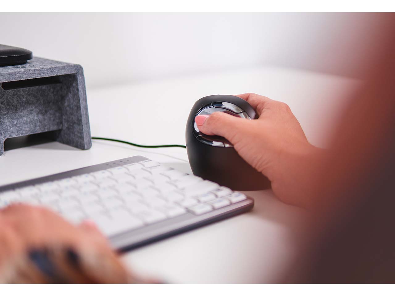 Bei längerer Nutzung einer Standardmaus kann es im Bereich der Schultern, Unterarme und Hände zu Schmerzen und Beschwerden kommen. Durch die ergonomische, vertikale Form entsteht eine Handschüttelhaltung. Hierbei knickt das Handgelenk weniger zur Seite und der Unterarm dreht sich weniger nach innen. Die Form unterstützt die Hand optimal und verhindert, dass Schmerzen in Arm und Handgelenk auftreten. Im Vergleich zu Standardmäusen können vertikale Mäuse so zu einer komfortableren Arbeitsweise beitragen. Die spezielle Form der Bakker Elkhuizen Maus liegt perfekt in der Hand, ohne sich wuchtig anzufühlen. Die extra breite Unterlippe trägt dazu bei, dass der kleine Finger sich nicht am Schreibtisch reibt.