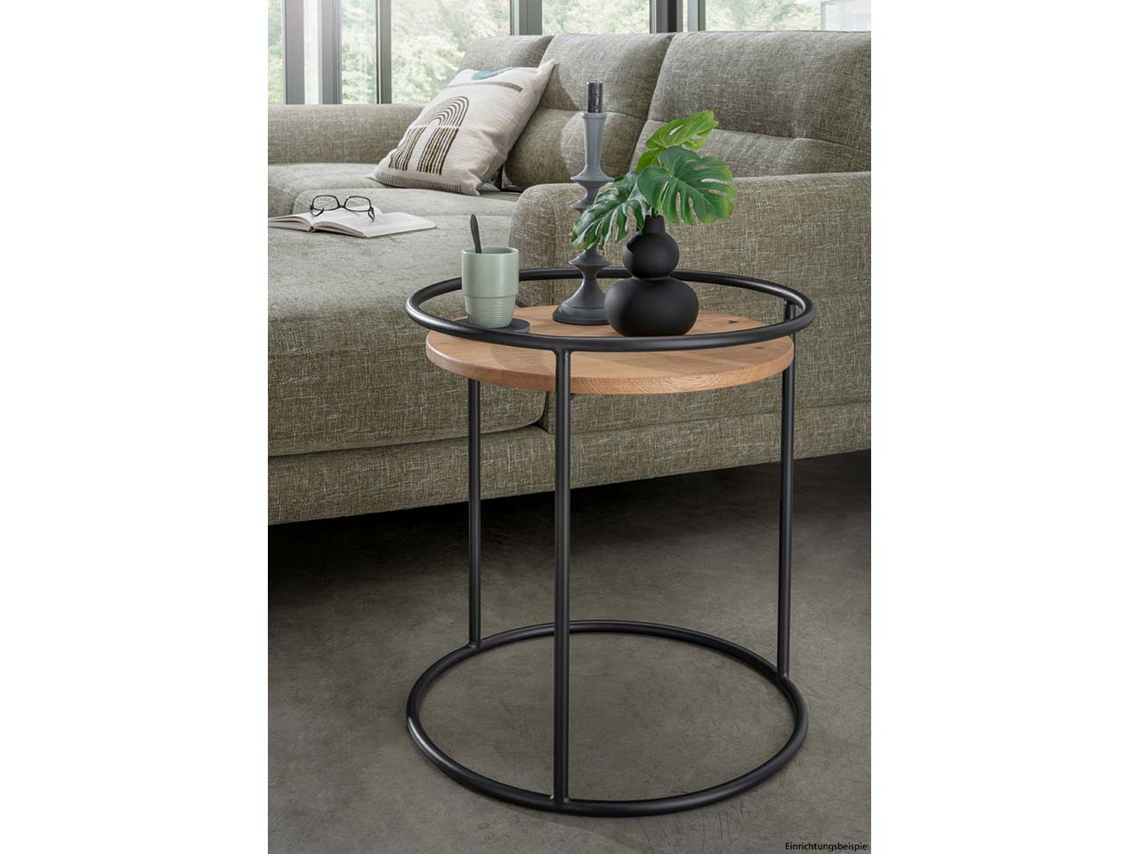 Mehr als nur ein Beistelltisch: Dieses Möbelstück ist ebenso praktisch wie wunderschön! Das Design ist mit dem Gestell, das die Tischplatte aus massiver, FSC-zertifizierter Wildeiche umschließt ein echter Hingucker. Die raffinierte Optik lebt von dem Kontrast, den das einzigartig gemaserte, warme Holz und der schwarz pulverbeschichtete Stahl geben. Durch das zeitlose, moderne Design und die langlebige Qualität kann der Beistelltisch über viele Jahre genutzt werden. B 50 x T 50 x H 52 cm.