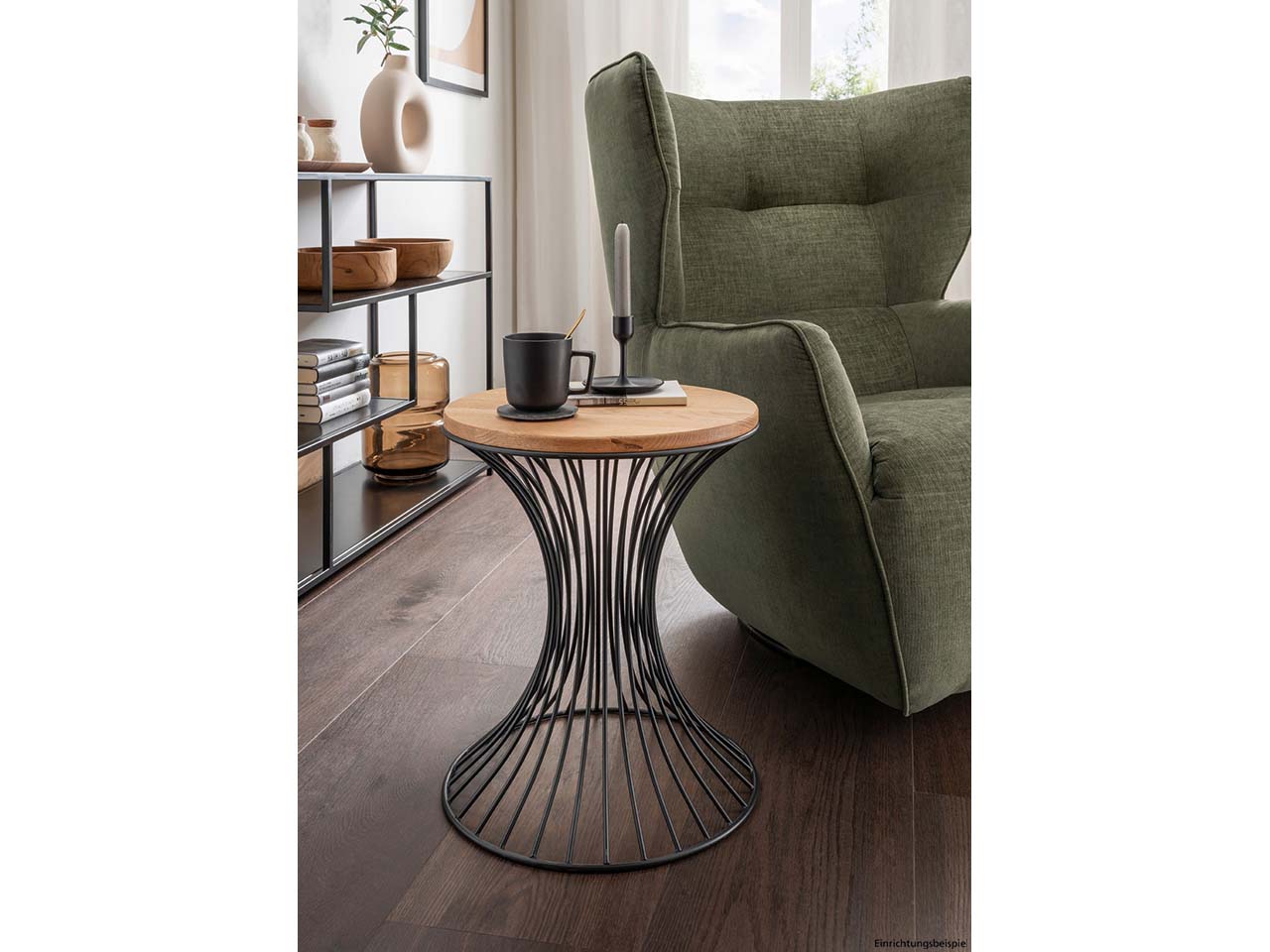 Beistelltisch und Designobjekt in Einem. Das schwarz pulverbeschichtete Gestell macht aus dem Tisch mehr als nur ein Möbelstück. Der Beistelltisch mit Platte aus massiver, FSC-zertifizierter Wildeiche passt in verschiedene Umgebungen. Er sieht neben der Couch genauso gut aus wie im Flur, im Ess- oder Schlafzimmer. Das moderne Design sorgt dafür, dass man lange Freude an dem Beistelltisch hat. B 40 x T 40 x H 50 cm.