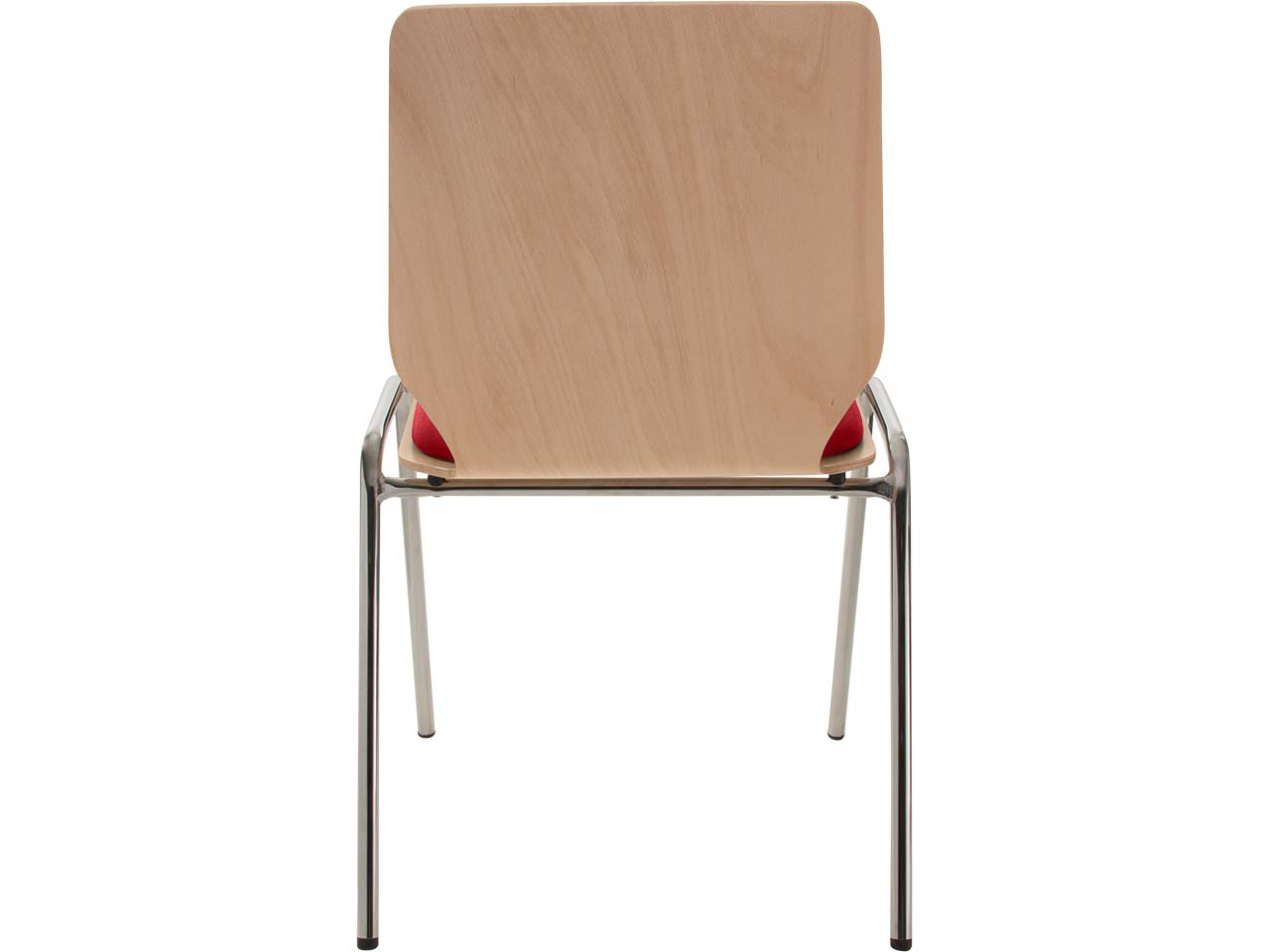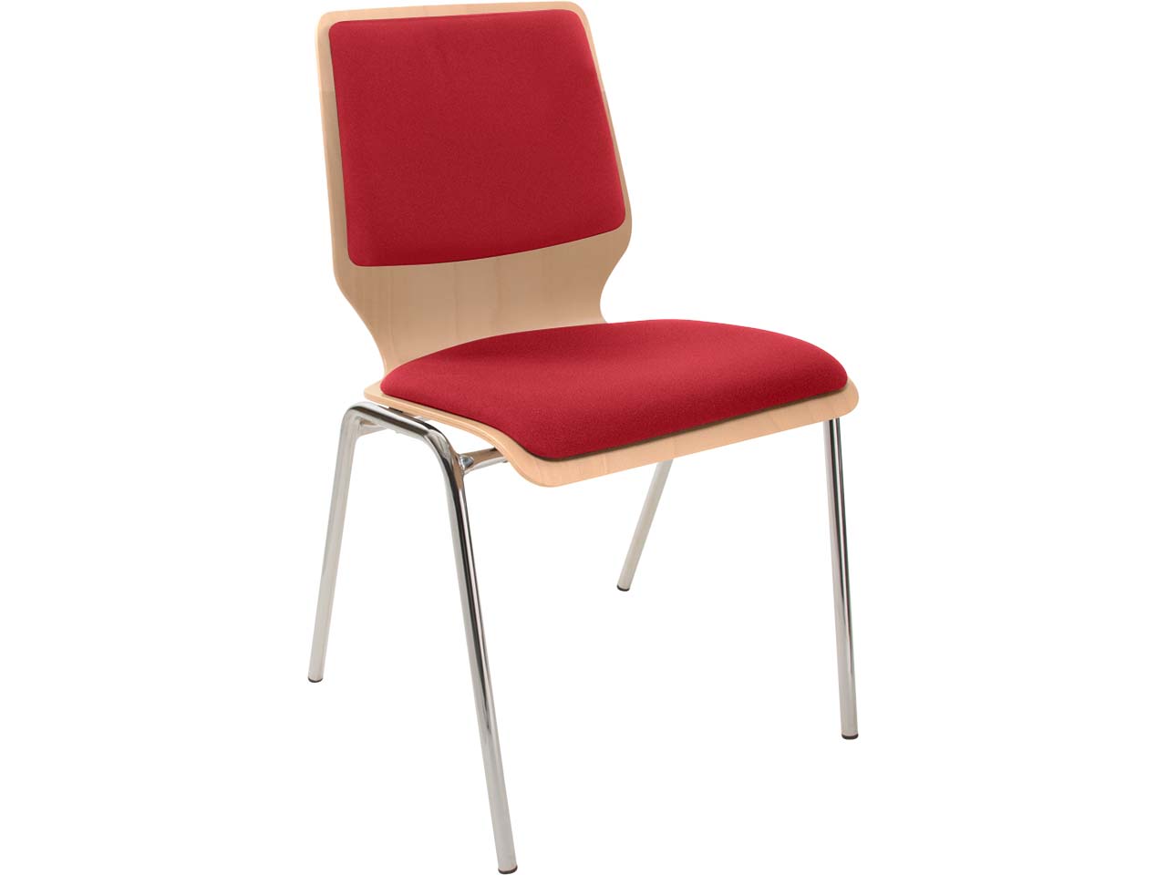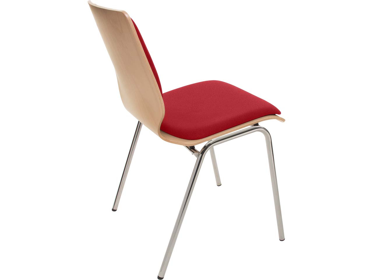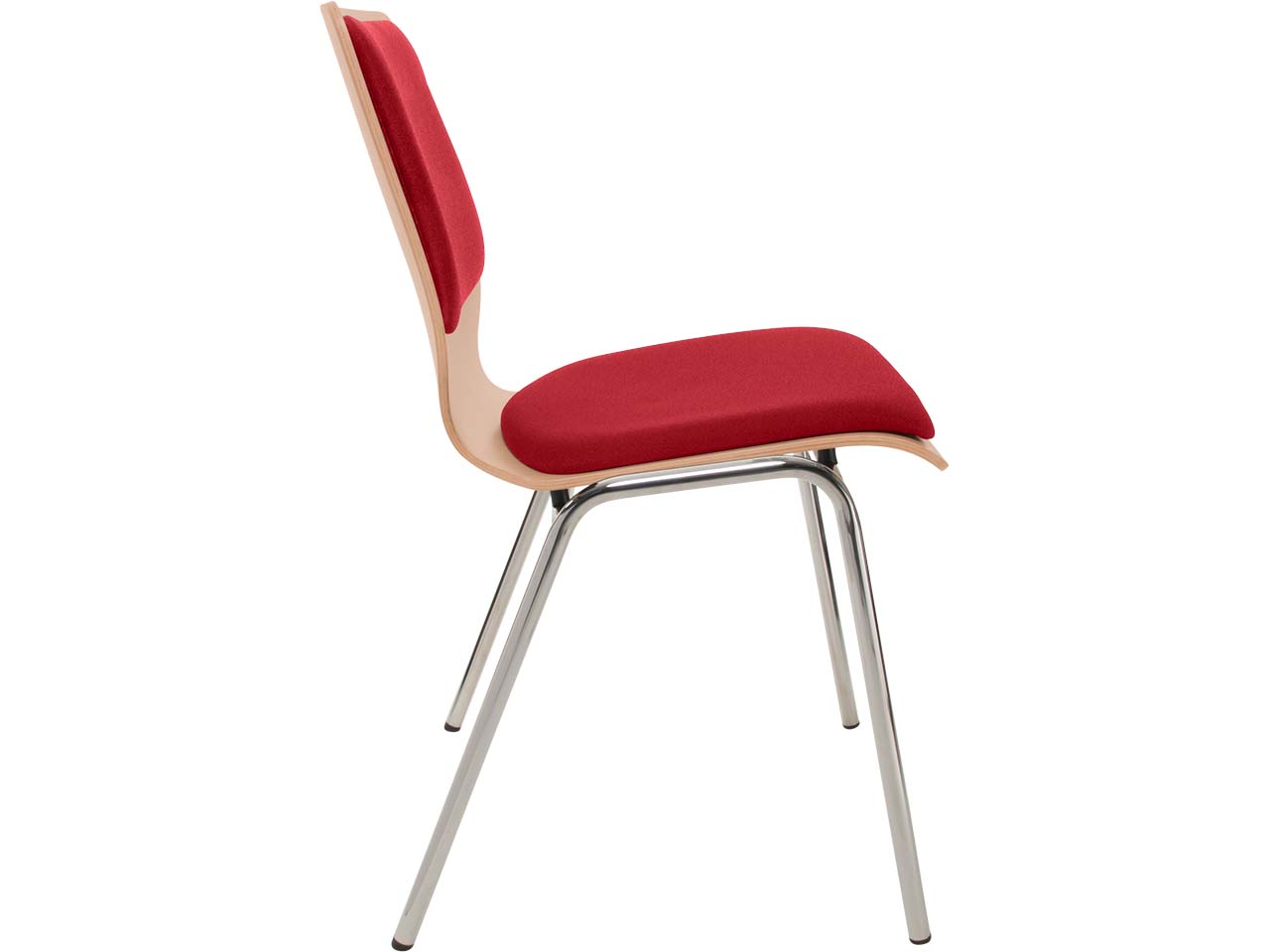 Bei Veranstaltungen, Seminaren, Konferenzen oder im Wartebereich hat dieser Besucherstuhl seinen großen Auftritt. Durch die Polsterung des Rückens und der Sitzfläche entsteht beim Sitzen ein hoher Komfort. Angebracht sind die austauschbaren Polster auf einer Schale aus Buchenholz, die mit Wasserlack nach B1 lackiert ist. Die Lackierung sorgt dafür, dass das Sitzmöbel schwer entflammbar und beständig gegen Desinfektionsmittel ist. Sanfte, harmonische Formgebung und ein stabiles, verchromtes Stahlgestell runden den Stuhl ab.