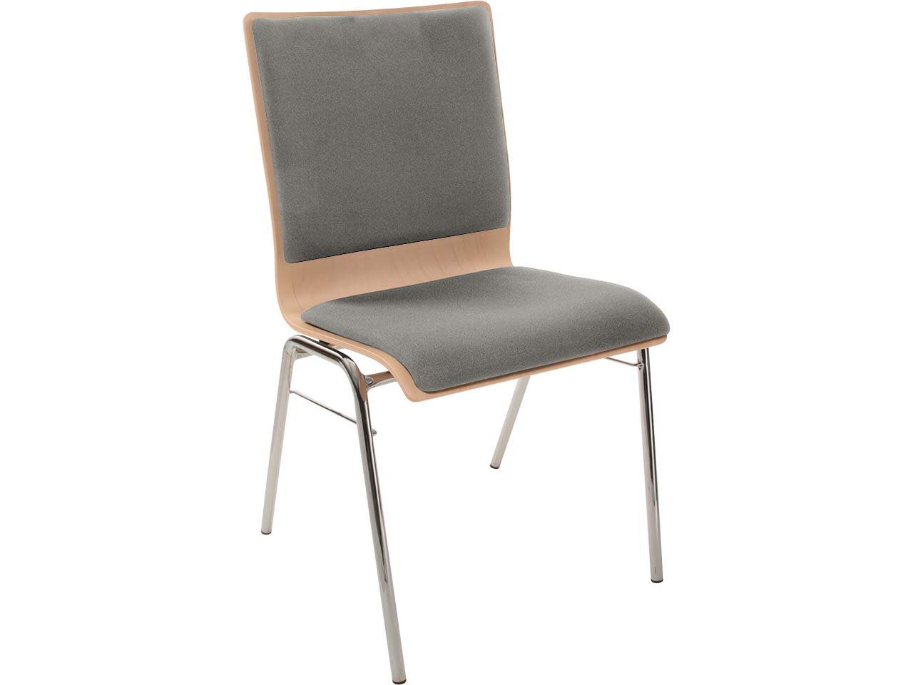 Ganz viel Komfort und schlichtes Design zeichnen diesen stapelbaren Besucherstuhl aus. An Sitzfläche und Rücken sind Polster angebracht, die dafür sorgen, dass man bequem sitzt. Damit ist der Stuhl ideal für Veranstaltungen, Seminare, Konferenzen oder den Wartebereich. Die Holzschale aus Buche ist mit Wasserlack nach B1 lackiert und damit schwer entflammbar und desinfektionsmittelbeständig. Die Polsterung ist austauschbar. Bis zu 12 Stühle können platzsparend gestapelt werden.