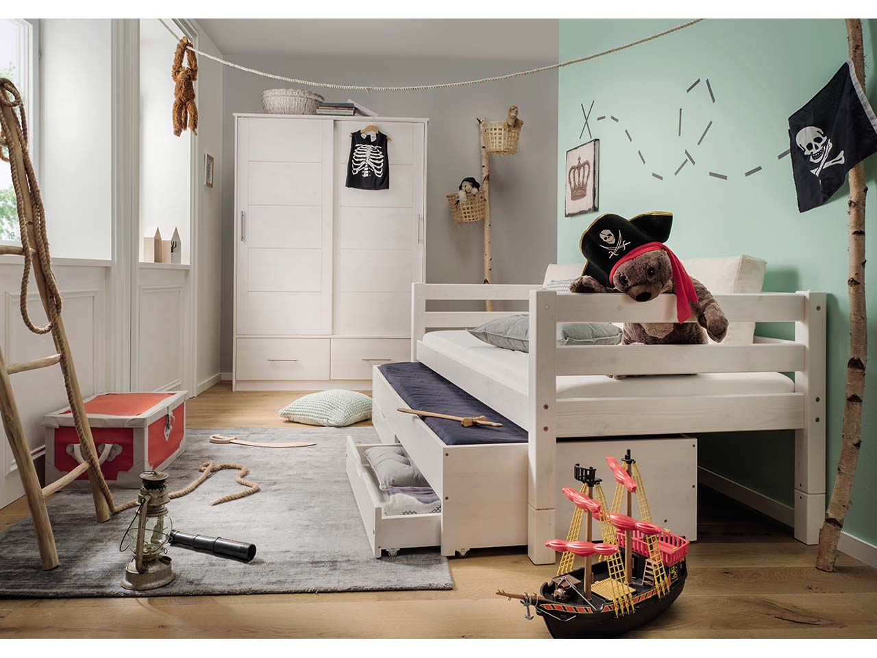 Dieses Bett ist multifunktional: Es dient als stabiles Einzelbett und kann noch um einen weiteren Liegeplatz erweitert werden! Bei Nichtgebrauch wird das Ausziehbett einfach wieder unter das Gestell geschoben. Für Bettwäsche ist Platz in den zwei Rollschubkästen. Das Kinderbett ist ideal, wenn nur begrenzt Raum zur Verfügung steht. Das Bettgestell ist aus massivem, FSC-zertifiziertem Kiefernholz gefertigt, das viel Natürlichkeit ins Kinderzimmer bringt. B 100 x T 210 x H 80 cm.
