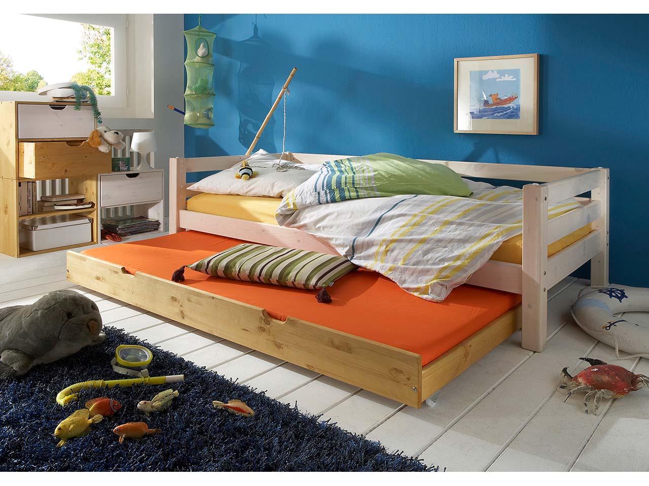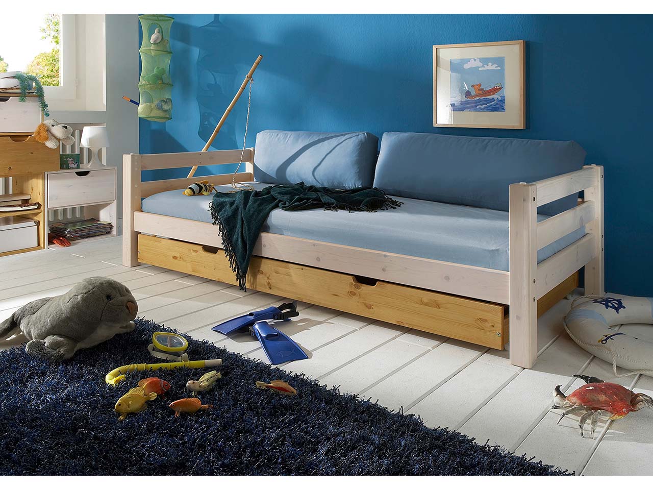 Aus einem Bett werden zwei: Der Schubkasten ist ideal, um ein Bett um eine zweite Liegefläche zu erweitern. Der Schubkasten passt perfekt unter das Gestell und kann bei Bedarf als Gästebett genutzt werden. Der passende Rollrost ist bereits im Lieferumfang enthalten. Wie die weiteren Möbel der gleichnamigen Serie ist auch der Bettschubkasten aus massivem, FSC-zertifiziertem Kiefernholz gefertigt und daher ausgesprochen strapazierfähig und langlebig. B 194 x T 94 x H 19,5 cm.