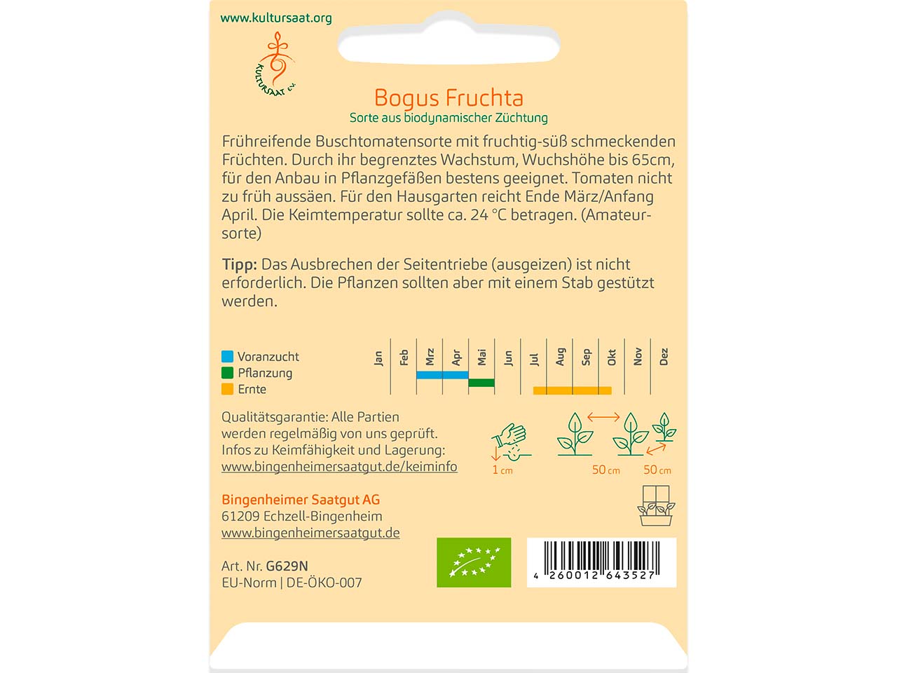 Im Balkon oder im Garten reift die Bogus Fruchta – eine fruchtig-süß schmeckende Buschtomate – zu köstlichen Früchten heran! Da das Wachstum begrenzt ist, eignet sich der Anbau im Pflanzgefäß. Idealerweise sollte die Pflanze mit einem Stab gestützt werden. Das Saatgut stammt aus biologisch-dynamischem Demeter-Anbau.