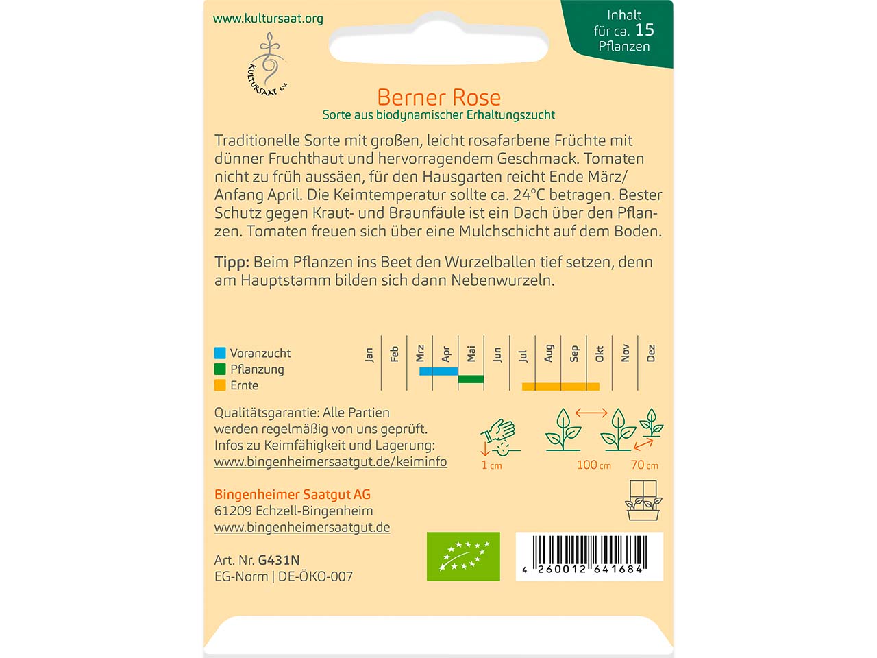 Berner Rose ist eine traditionelle Fleischtomatensorte, die sich durch einmalig köstlichen Geschmack und eine hübsche Fruchtfarbe mit rosa Nuancen auszeichnet. Am besten erhalten die Tomaten ein Dach über dem Kopf, sodass sie vor Kraut- und Braunfäule geschützt sind. Das Saatgut aus biologisch-dynamischem Demeter-Anbau reicht für rund 15 Pflanzen.
