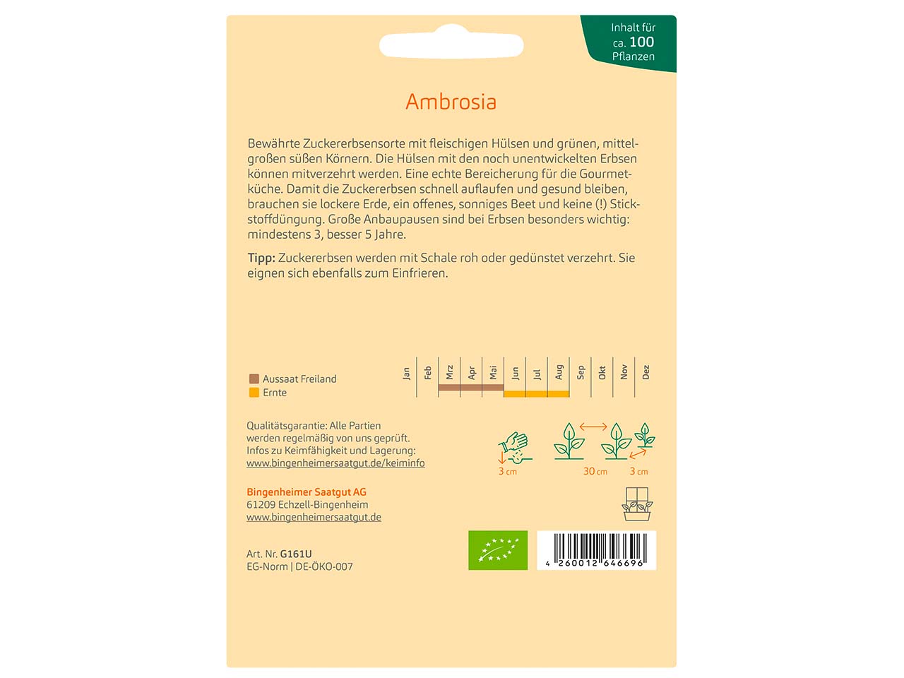 Die Zuckererbse Ambrosia besticht durch ihre fleischigen, zarten Hülsen und süßen Körner. Diese traditionelle, mittelfrühe Sorte überzeugt nicht nur mit ihrem aromatischen Geschmack, sondern auch mit einer hohen Ertragsleistung. Besonders vielseitig in der Küche, können die Hülsen samt Körnern roh oder gedünstet genossen werden. Ideal für die anspruchsvolle Gourmetküche – ein Highlight auf jedem Teller. Das Saatgut aus biologisch-dynamischem Demeter-Anbau reichen für bis 100 Pflanzen.