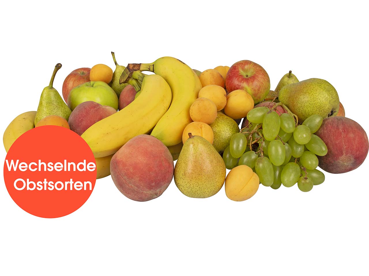 Verschiedene Obstsorten 6 Birnen 8 Bananen 8 Äpfel 6 Nektarinen weiß 5 Grapefruit pink |