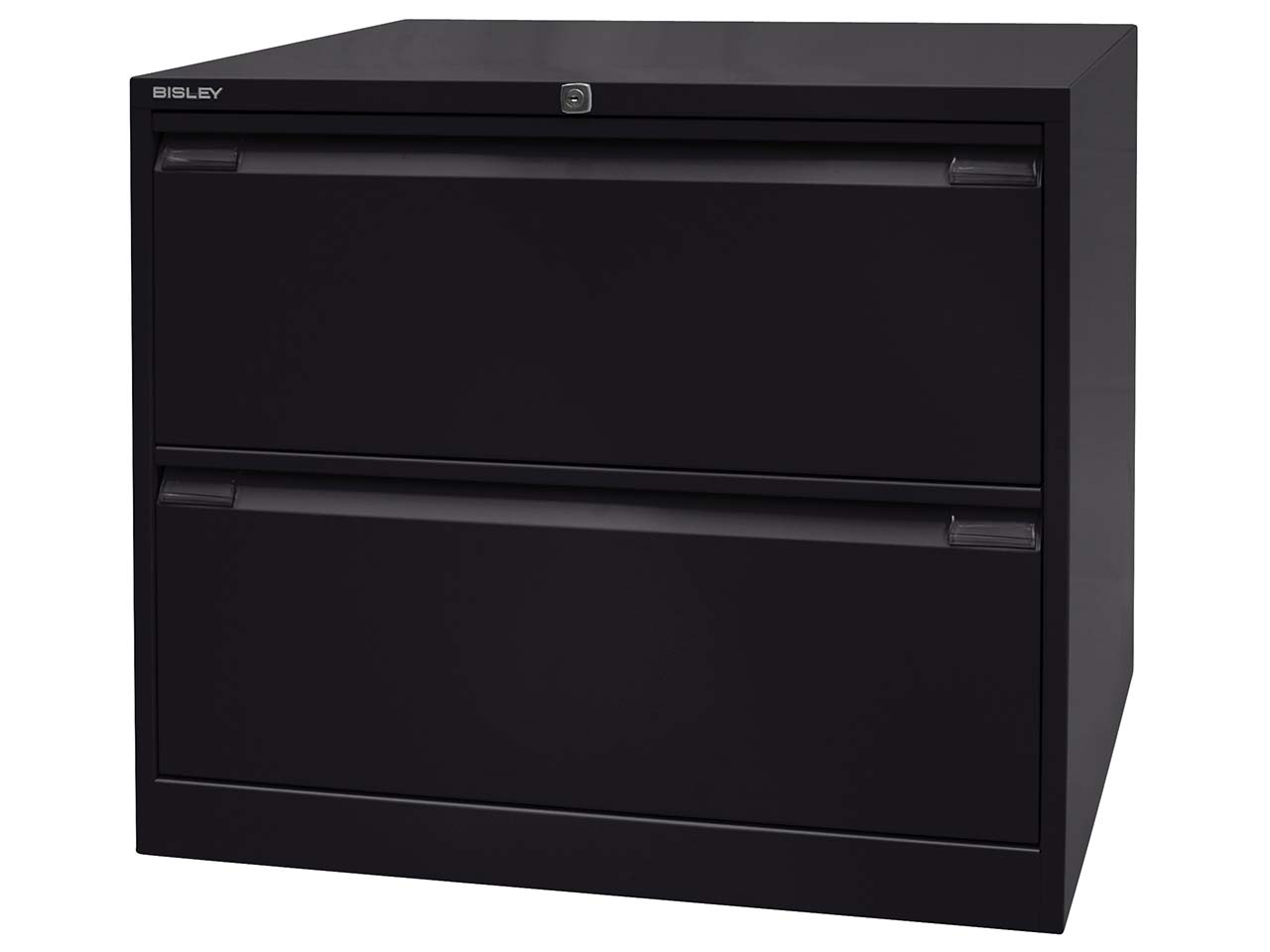 Der BISLEY Hängeregistraturschrank aus stabilem, langlebigem Stahl bietet in den 2 doppelbahnigen Schubladen viel Platz für Mappen im Format DIN A4. Die Schubladen laufen auf den kugelgelagerten Schienen leise. Vollauszug und Doppelauszugssperre für ein optimiertes Arbeiten. Mit Griffleisten und Etikettenfenster. B 80 x T 62,2 x H 71,1 cm. Farbe schwarz.