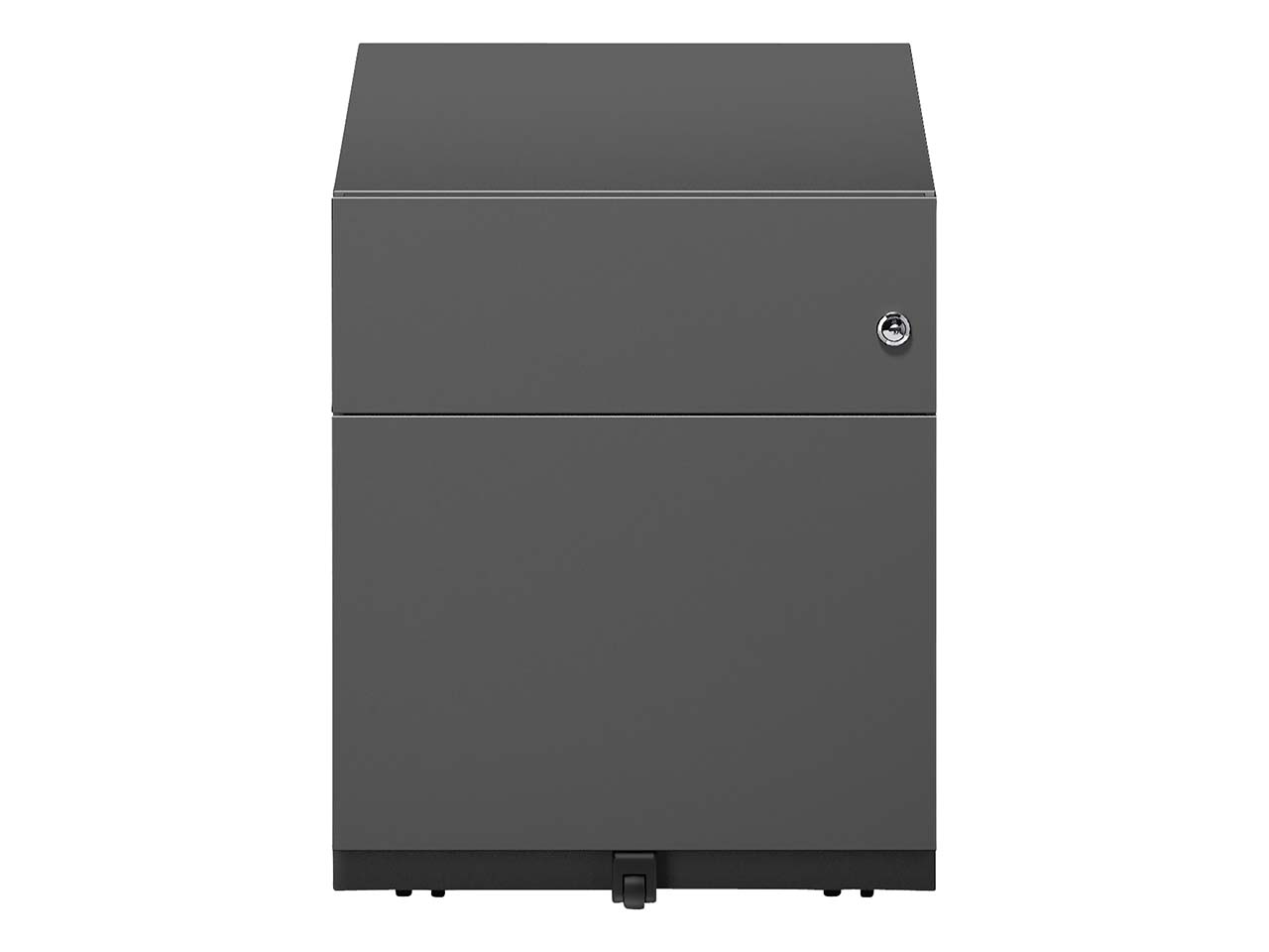 Der BISLEY Rollencontainer "Note" in geradlinigem Design verfügt über eine Universal- und eine Hängeregistraturschublade, die sich jeweils zu 80 % ausziehen lassen. Durch die 4 unsichtbaren Lenkrollen wird das Möbelstück mobil. Eine 5. Rolle dient der Kippsicherung. Ein Zentralschloss befindet sich in der oberen Schublade. Für Format DIN A4. B 42 x T 77,5 x H 49,5 cm.