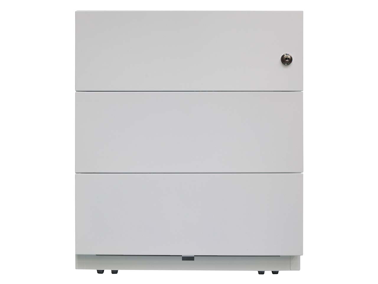 Mit dem geradlinig designten BISLEY Rollencontainer "Note" bringen Sie Unterlagen und mehr bis Format DIN A4 ordentlich unter. Die 3 Schubladen sind zu 80 % ausziehbar. Die obere Schublade verfügt über ein Zentralschloss, sodass Sie den Rollencontainer abschließen können. Durch die 4 unsichtbaren Lenkrollen ist das Möbelstück mobil. Eine 5. Rolle dient der Kippsicherung. B 42 x T 77,5 x H 49,5 cm.