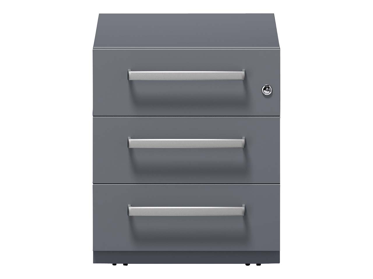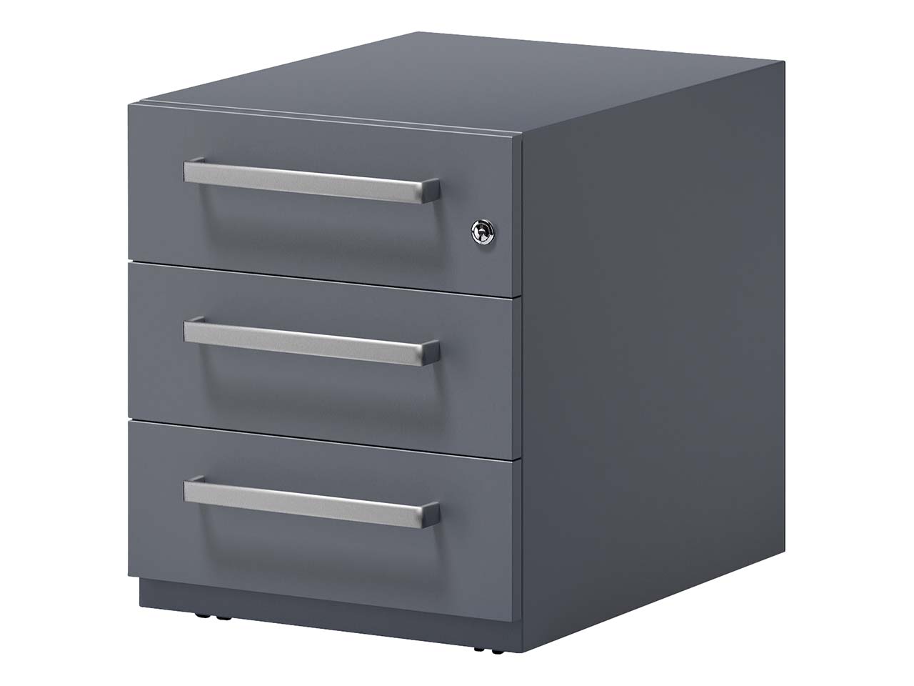 Der geradlinig designte BISLEY Rollencontainer "Note" ist sehr funktional: 3 Schubladen mit aluminium-matten Griffen lassen bis zu 80 % ausziehen und bieten Platz für Unterlagen, Dokumente, etc. bis Format DIN A4. Durch die 4 unsichtbaren Lenkrollen ist der Rollencontainer auch mobil. Eine 5. Rolle dient als Kippsicherung. Das Zentralschloss ist in der obersten Schublade zu finden. B 42 x T 56,5 x H 49,5 cm.