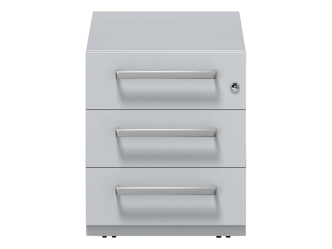 Geradliniges Design und 3 Schubladen für ausreichend Stauraum zeichnen den BISLEY Rollencontainer "Note" aus. Über die aluminium-matten Griffe lassen sich die Schubladen bis zu 80 % ausziehen und bieten Platz bis Format DIN A4. Dank der 4 unsichtbaren Lenkrollen ist der Rollencontainer mobil. Eine 5. Rolle dient zur Kippsicherung. In der oberen Schublade befindet sich ein Zentralschloss. B 42 x T 77,5 x H 49,5 cm.