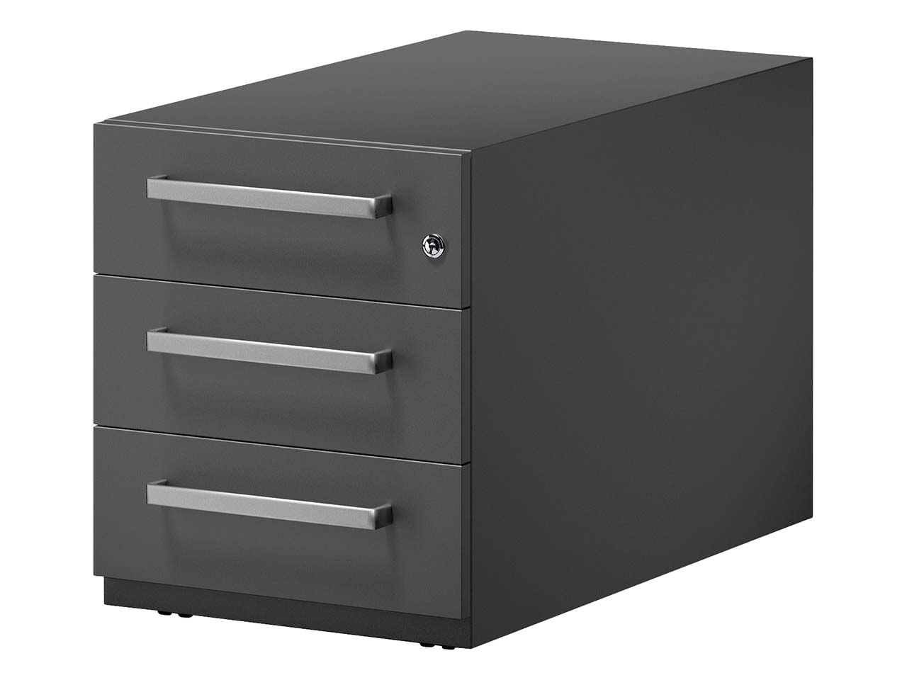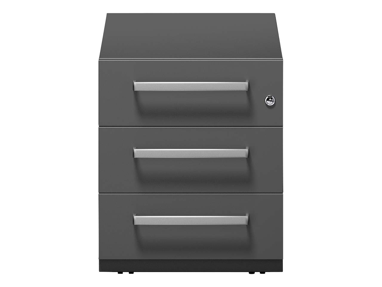 Geradliniges Design und 3 Schubladen für ausreichend Stauraum zeichnen den BISLEY Rollencontainer "Note" aus. Über die aluminium-matten Griffe lassen sich die Schubladen bis zu 80 % ausziehen und bieten Platz bis Format DIN A4. Dank der 4 unsichtbaren Lenkrollen ist der Rollencontainer mobil. Eine 5. Rolle dient zur Kippsicherung. In der oberen Schublade befindet sich ein Zentralschloss. B 42 x T 77,5 x H 49,5 cm.