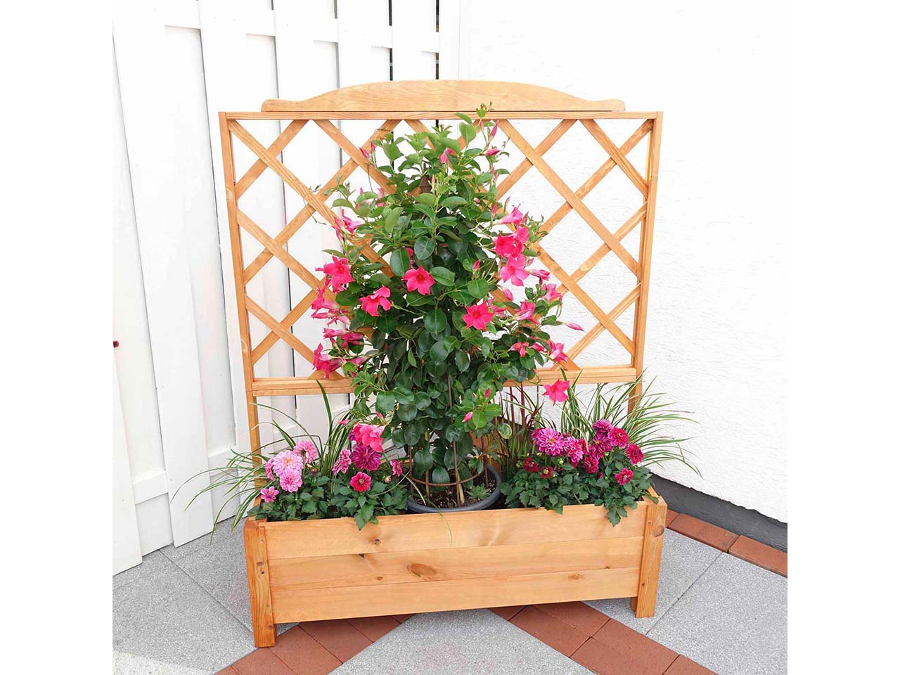 Schling-, Rank- und Kletterpflanzen wie Wein, Geißblatt oder Kletterrose finden in diesem Blumenkasten ein ideales Zuhause. Am stabilen Rankgitter können sich die Pflanzen hochziehen und finden guten Halt. So entsteht ein natürlicher, "grüner" Wind- und Sichtschutz.