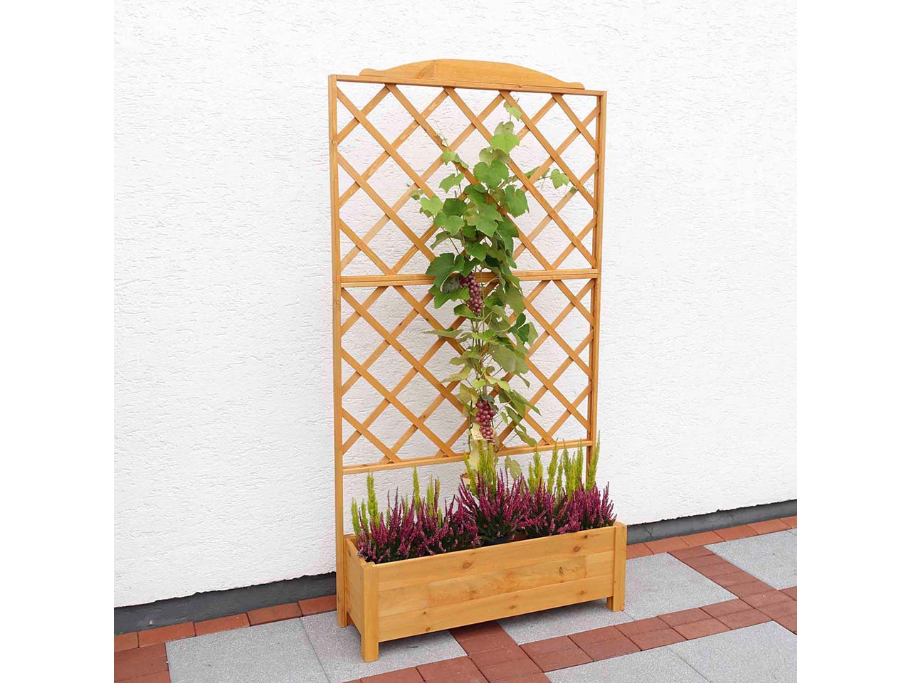 Schling-, Rank- und Kletterpflanzen wie Wein, Geißblatt oder Kletterrose finden in diesem Blumenkasten ein ideales Zuhause. Am stabilen Rankgitter können sich die Pflanzen hochziehen und finden guten Halt. So entsteht ein natürlicher, "grüner" Wind- und Sichtschutz.
