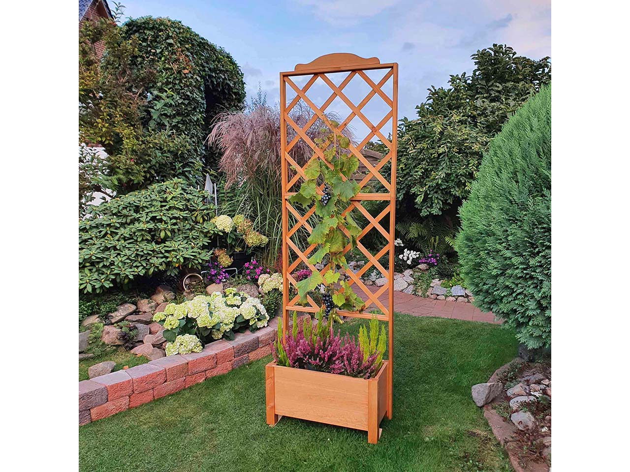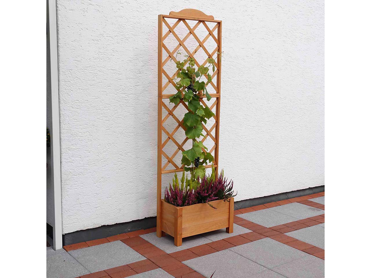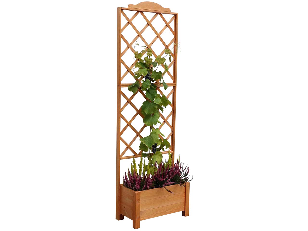 Schling-, Rank- und Kletterpflanzen wie Wein, Geißblatt oder Kletterrose finden in diesem Blumenkasten ein ideales Zuhause. Am stabilen Rankgitter können sich die Pflanzen hochziehen und finden guten Halt. So entsteht ein natürlicher, "grüner" Wind- und Sichtschutz.