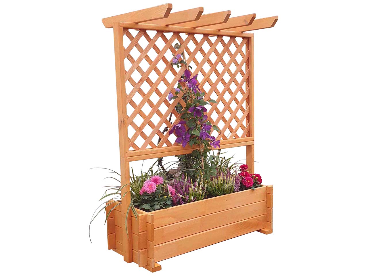 Der Blumenkasten mit Rankgitter und Pergola wird aus FSC-zertifiziertem Kiefernholz gefertigt. Durch das FSC-Siegel wird garantiert, dass das verwendete Holz aus kontrollierter, vorbildicher Forstwirtschaft stammt. Die Wetterschutz-Imprägnierung wird auf Wasserbasis hergestellt.