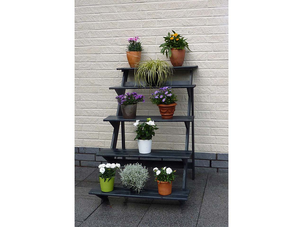 Fünf Stufen für Blumen, Pflanzen und Co.! Die Blumentreppe aus massivem, FSC-zertifiziertem Kiefernholz ist wetterfest imprägniert und so das ganze Jahr über eine echte Augenweide. Das Designobjekt passt in den Garten, auf die Terrasse oder auch auf große Balkons. Wo sie auch steht, sie zieht alle Blicke auf sich. Und das Beste: Sie lässt sich ganz leicht montieren. B 78 x T 100 x H 109 cm.