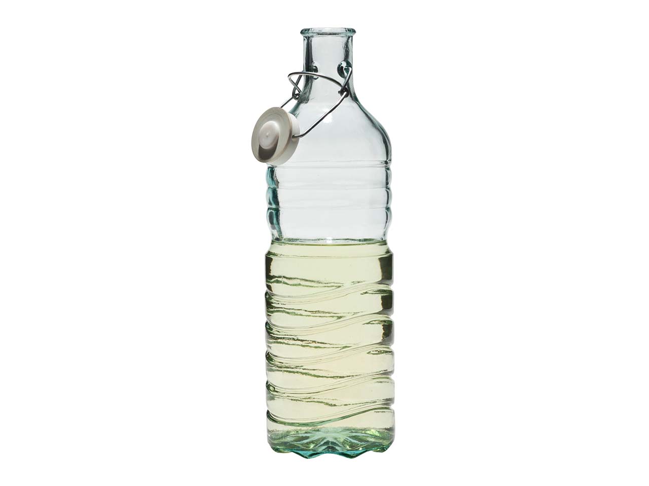 Dekorative Flasche aus 100 % Recyclingglas für Ihr Lieblingsgetränk. Der Bügelverschluss dichtet zuverlässig ab. Herstellung in Spanien. Höhe 33,5 cm, Ø 9,5 cm, Volumen 1,5 l.