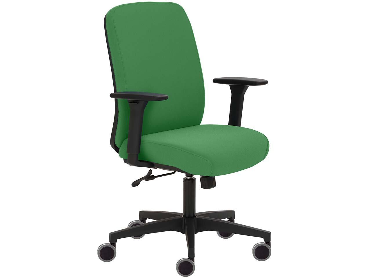 Sitzkomfort pur: Die Sitzfläche des Bürodrehstuhls ist besonders stark gepolstert, wodurch maximaler Komfort erzielt wird. Die Rückenlehne mit verstellbarer Lordosenstütze für zusätzliche Unterstützung beim Sitzen ist ebenfalls gepolstert. Als Bezug kommt ein Stoff aus recyceltem post-consumer PET zum Einsatz. Die Synchronmechanik, die bevorzugt in hochwertigen Bürodrehstühlen verbaut wird, passt sich dem Körpergewicht automatisch an. Die Technik sorgt dafür, dass der Körper in verschiedenen Sitzpositionen optimal unterstützt wird und sich die Sitzhaltung permanent verändert. Dadurch entspannen sich die Muskeln, die Bandscheiben werden entlastet und die Durchblutung gefördert. Armlehnen und Sitzhöhe lassen sich individuell an die persönlichen Bedürfnisse anpassen. Das Fußkreuz ist stabil designt und mit Hartbodenrollen ausgestattet.