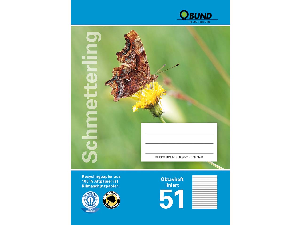 Das linierte BUND Oktavheft mit Lineatur 51 besteht aus Recyclingpapier und ist mit dem Blauen Engel ausgezeichnet. Weißegrad 80 % nach ISO. Motiv Schmetterling.