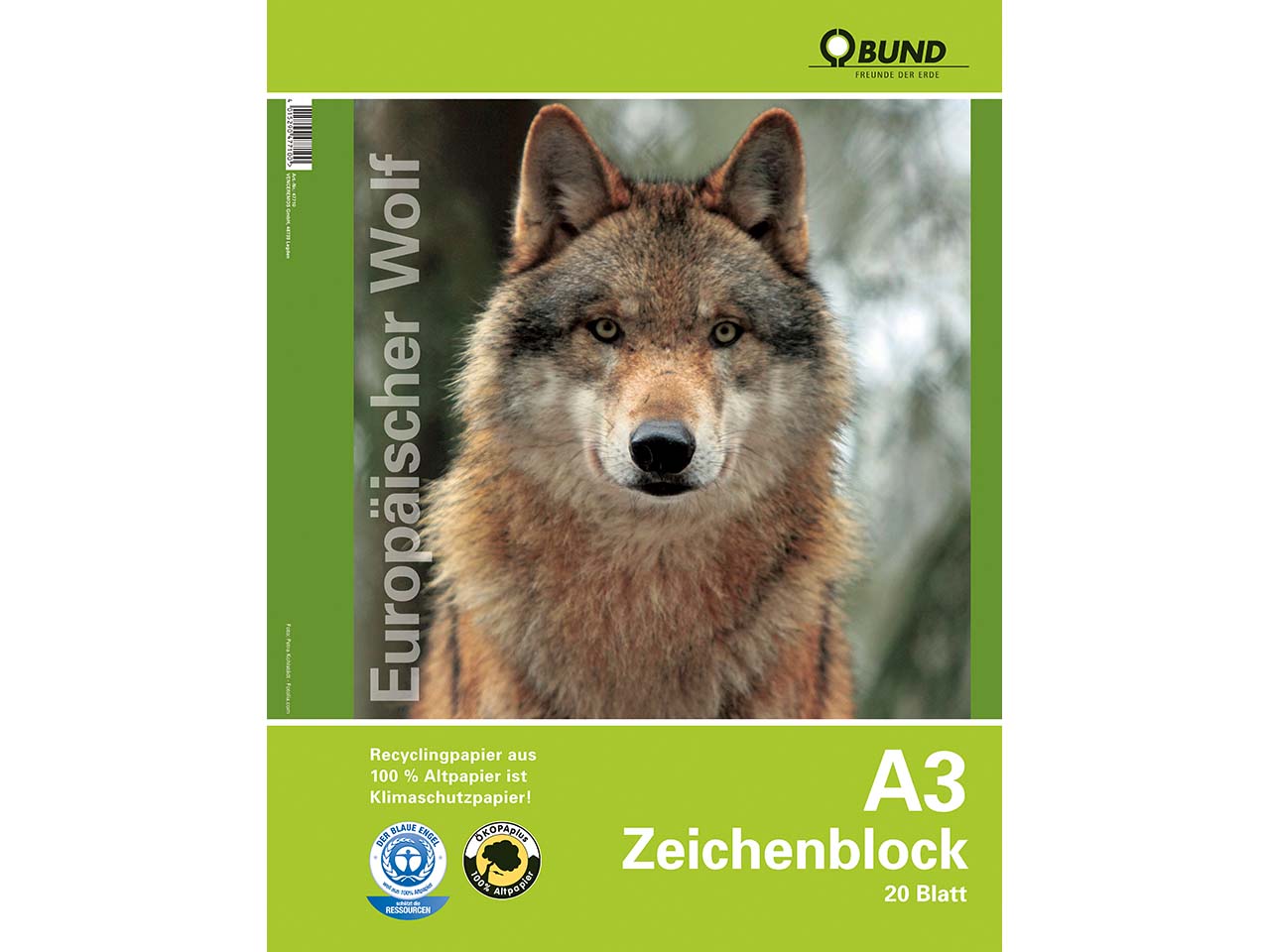 Der BUND Zeichenblock mit Tiermotiv auf der Vorderseite sowie interessanten Informationen zum abgebildeten Tier und zum BUND auf der Rückseite. Zum Zeichnen, Malen, Skizzieren. Einseitig (lange Seite) geleimt. Umweltverträgliches Recyclingpapier, Mit dem Blauen Engel ausgezeichnet. 20 Blatt, Format DIN A3, Grammatur 80 g/m².