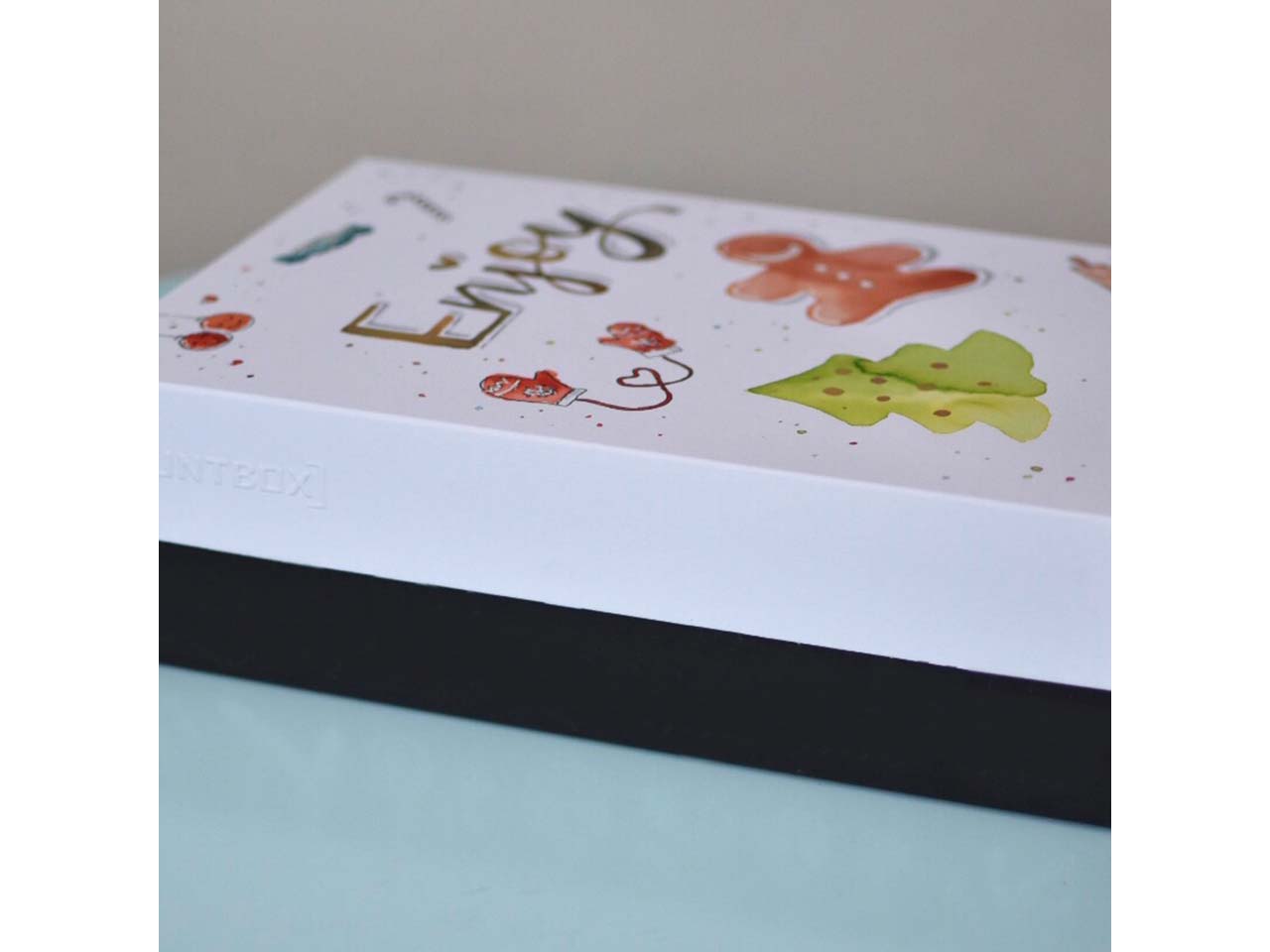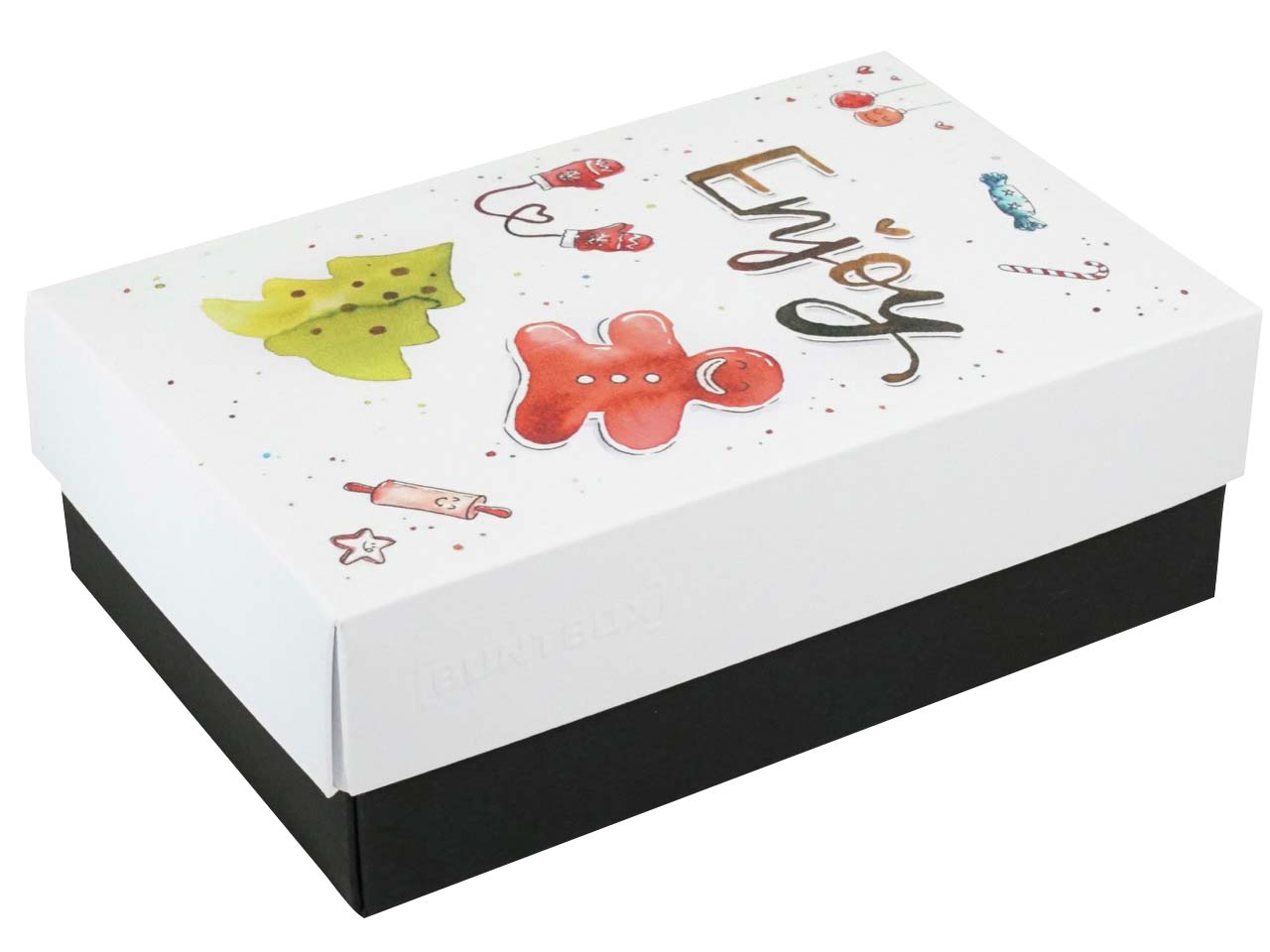 Verpacken Sie die Geschenke für Ihre Liebsten in der hübschen Buntbox-Weihnachts-Geschenkbox "Enjoy". Das Oberteil der Box ist liebevoll mit weihnachtlichen Motiven gestaltet, die für Freude sorgen. Gestalten Sie das unbedruckte, schwarze Unterteil noch individuell mit einem weißen Fineliner und geben Sie Weihnachtsgeschenken so eine ganz persönliche Note. Mit einer Kartonstärke von 350 g/m² ist die Box aus Recyclingkarton sehr stabil. Erhältlich in zwei Größen.