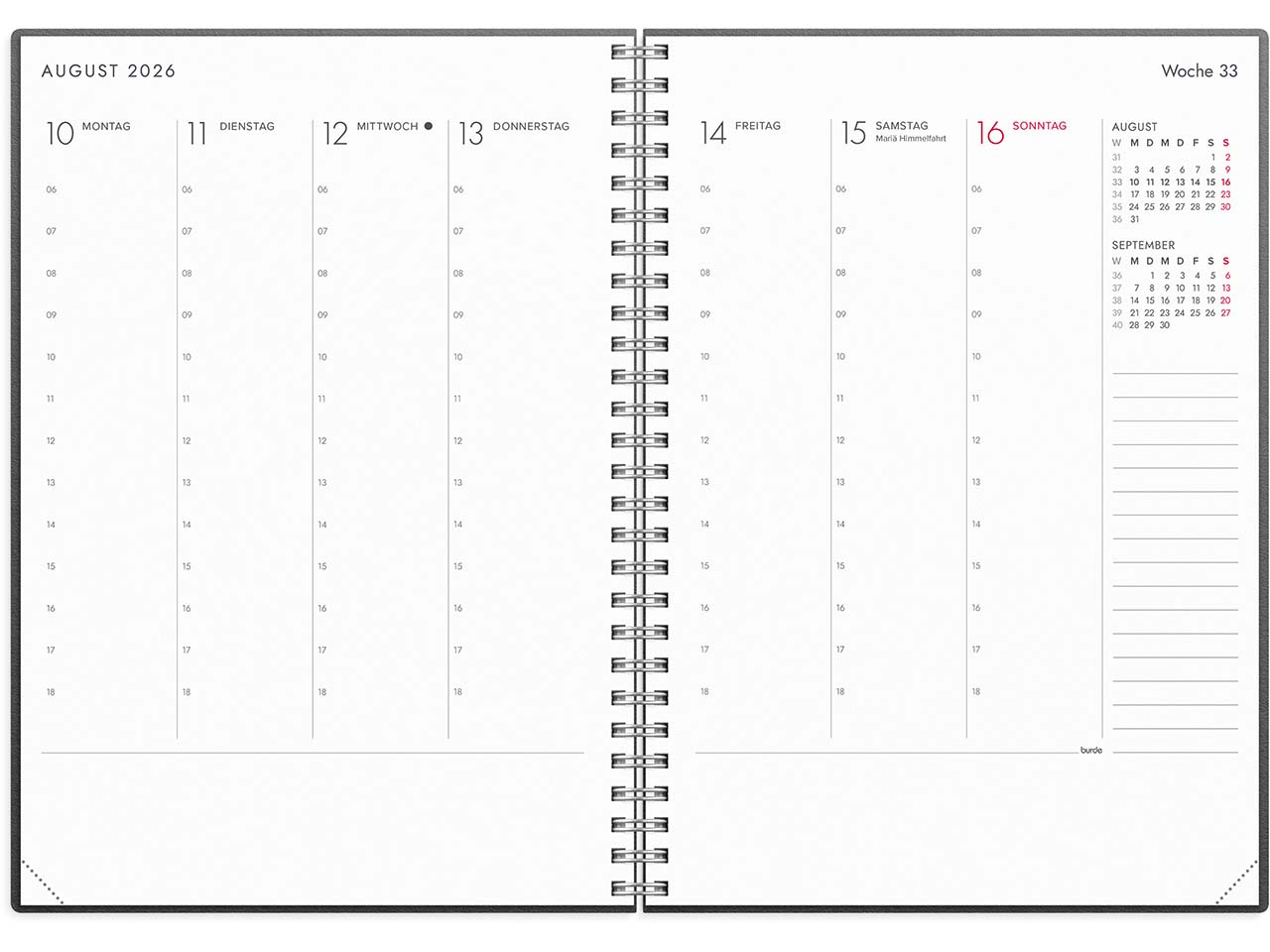| Kalenderaufteilung: | 1 Woche/Doppelseite |