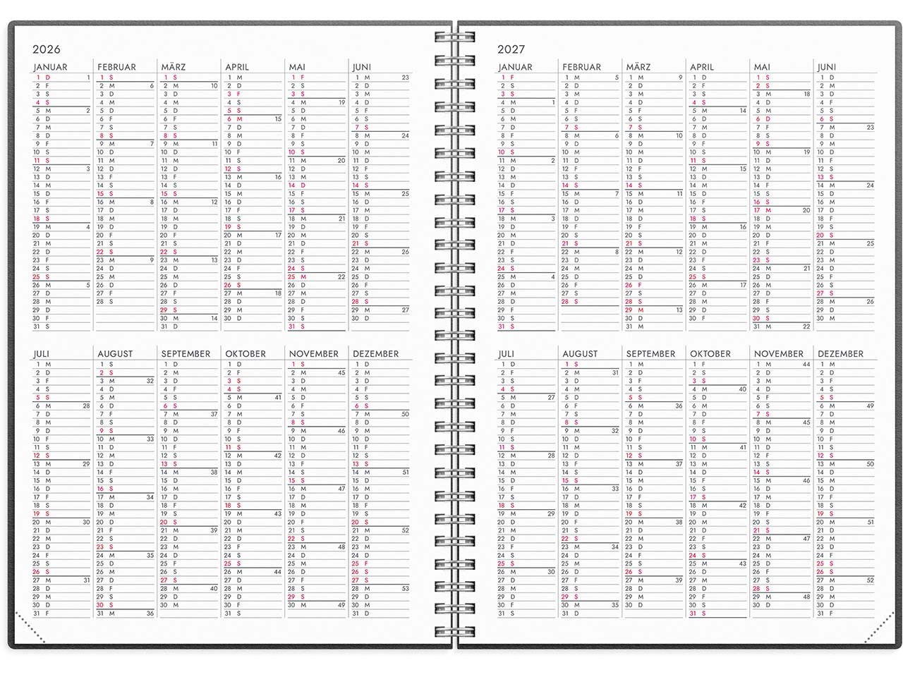 - Mit Jahresübersicht und wöchentlichen Seiten