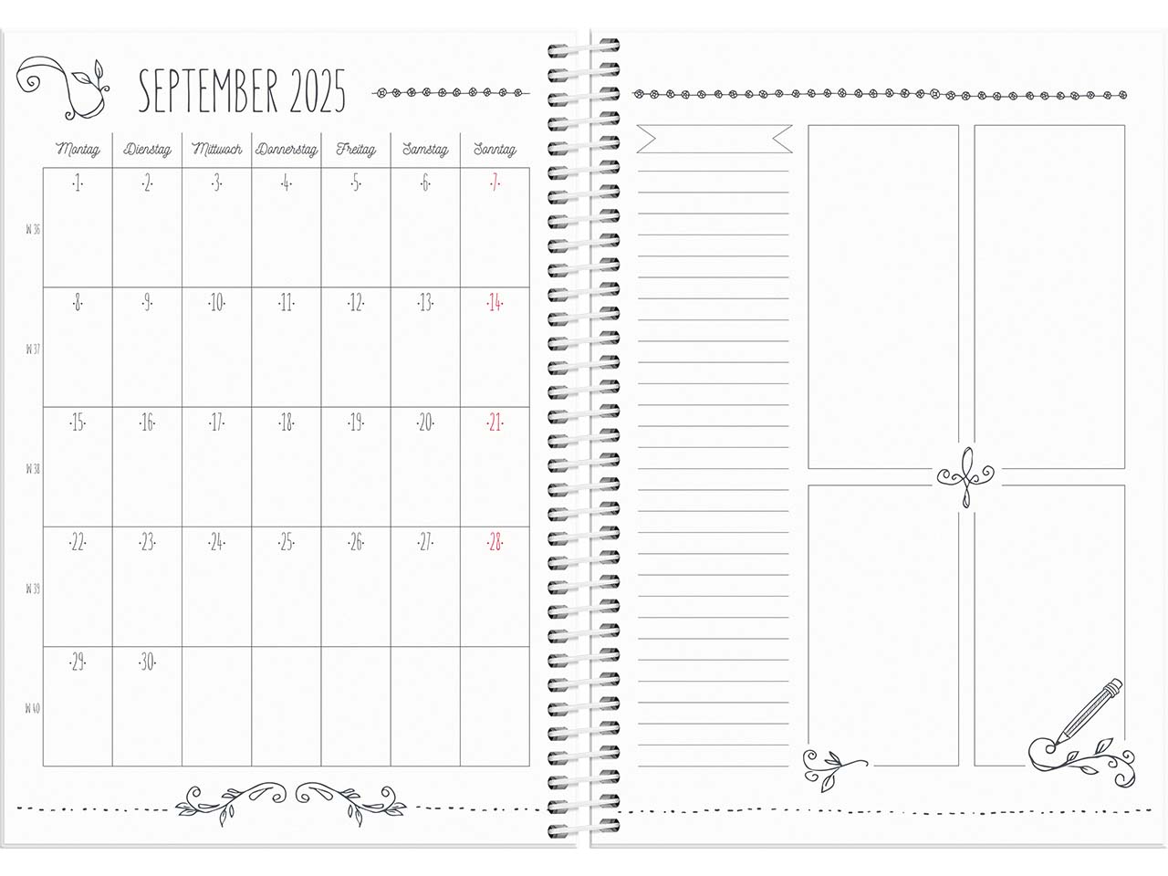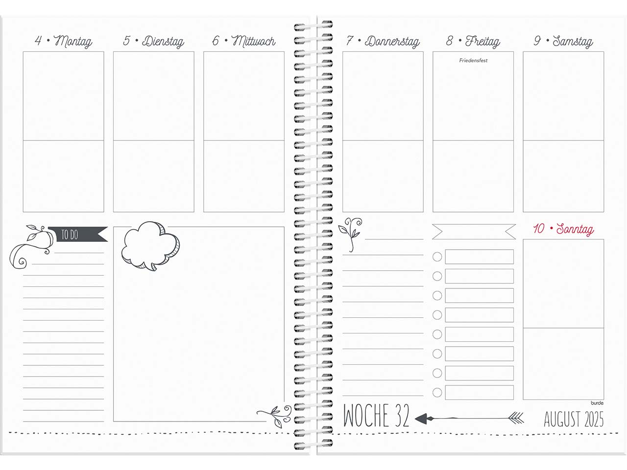| Kalenderaufteilung: | 1 Woche/Doppelseite |