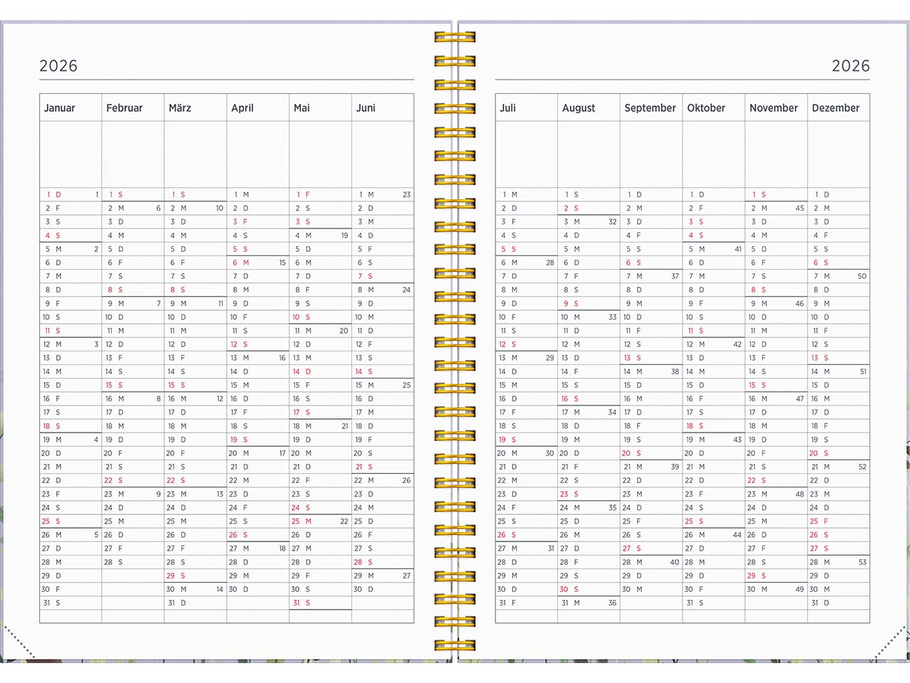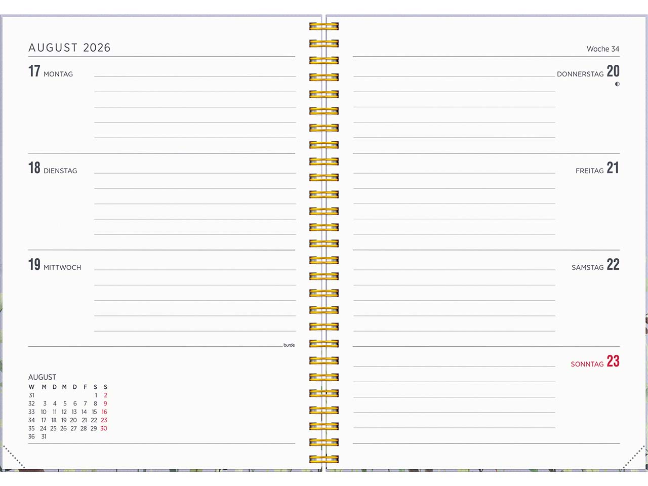 | Kalenderaufteilung: | 1 Woche/Doppelseite |