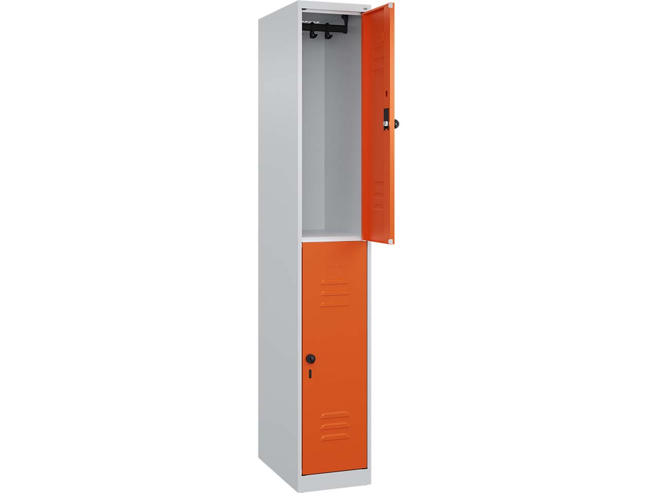 Der doppelstöckige Spind bietet eine praktische und platzsparende Lösung mit einem Abteil und zwei Fächern bei einer Breite von 300 mm. Der Korpus besteht aus einer robusten Stahlkonstruktion mit einer hochwertigen Einbrennbeschichtung, die UV- und korrosionsbeständig ist. Jedes Fach verfügt über eine stabile Garderobenstange mit drei verdrehsicheren Doppel-Schiebehaken. Belüftungsöffnungen oben und unten sorgen für eine gute Luftzirkulation. Die Türen sind aus Stahl, haben Soft-Anschlag, geschlossene Seitenprofile für mehr Stabilität und lassen sich um 110 Grad öffnen. Bodengleiter schützen sowohl den Schrank als auch den Boden. Zwei ergonomische Sicherheits-Drehriegel ermöglichen die Nutzung von Vorhängeschlössern. B 30 x T 50 x H 185 cm.