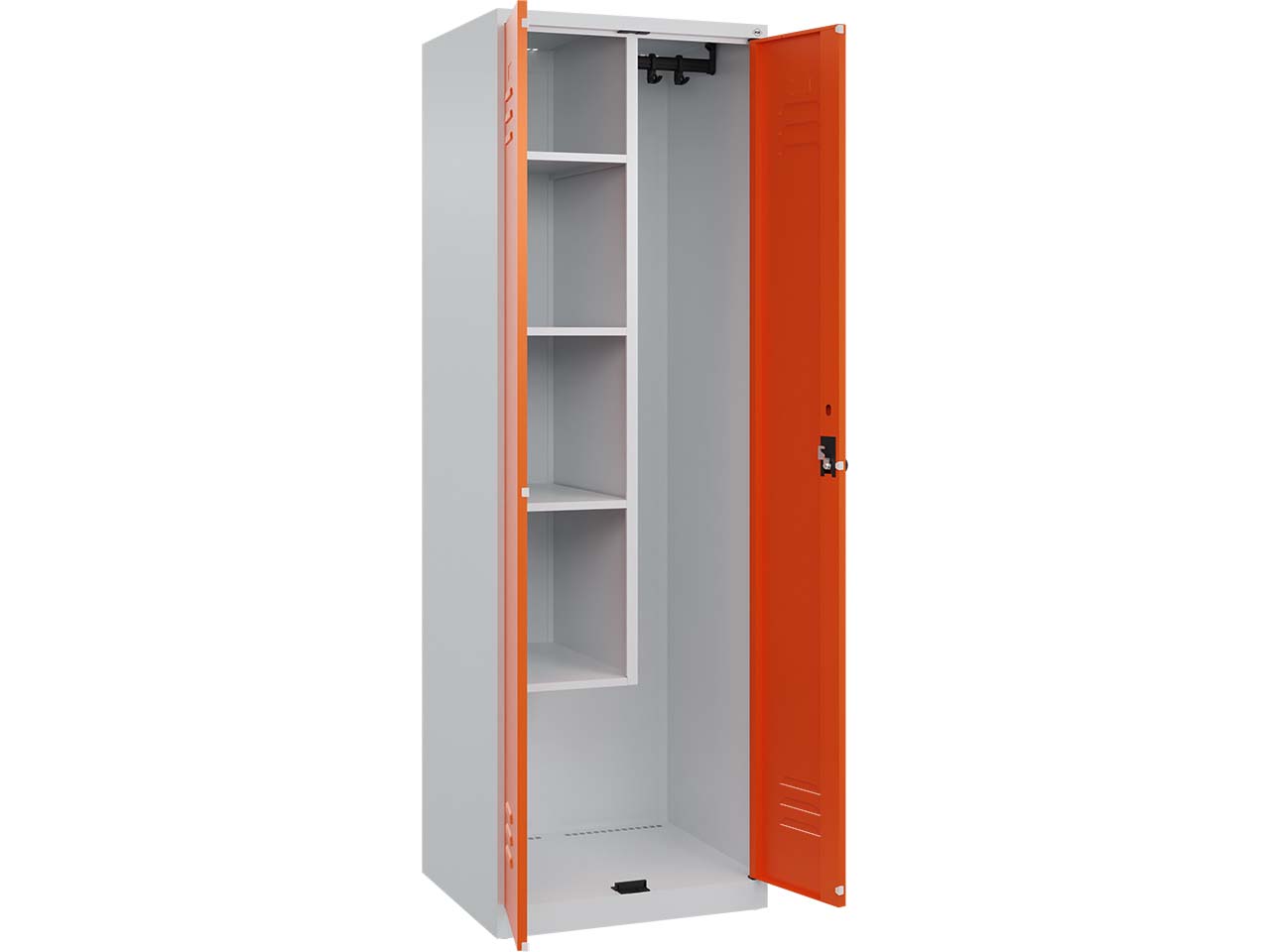 Der Putzmittel-Spind eignet sich für die ordentliche Unterbringung von Reinigungsmitteln, Eimern, etc. Der Korpus besteht aus einer stabilen Stahlkonstruktion mit einer hochwertigen Einbrennbeschichtung, die UV- und korrosionsbeständig ist. Innen verfügt der Spind über eine verkürzte Mitteltrennwand, vier Fachböden auf der linken Seite sowie einen Ablageboden und eine stabile Garderobenstange mit drei verdrehsicheren Doppel-Schiebehaken auf der rechten Seite. Die hinteren Belüftungsöffnungen sorgen für eine optimale Luftzirkulation. Die zueinander schlagenden Türen ermöglichen einen gemeinsamen Verschluss und sind mit Soft-Anschlag sowie geschlossenen Seitenprofilen ausgestattet, die für hohe Stabilität sorgen. Bodengleiter schützen sowohl den Schrank als auch den Boden. Ein ergonomischer Sicherheits-Drehriegel für Vorhängeschlösser sorgt für sicheren Verschluss. B 60 x T 50 x H 185 cm.