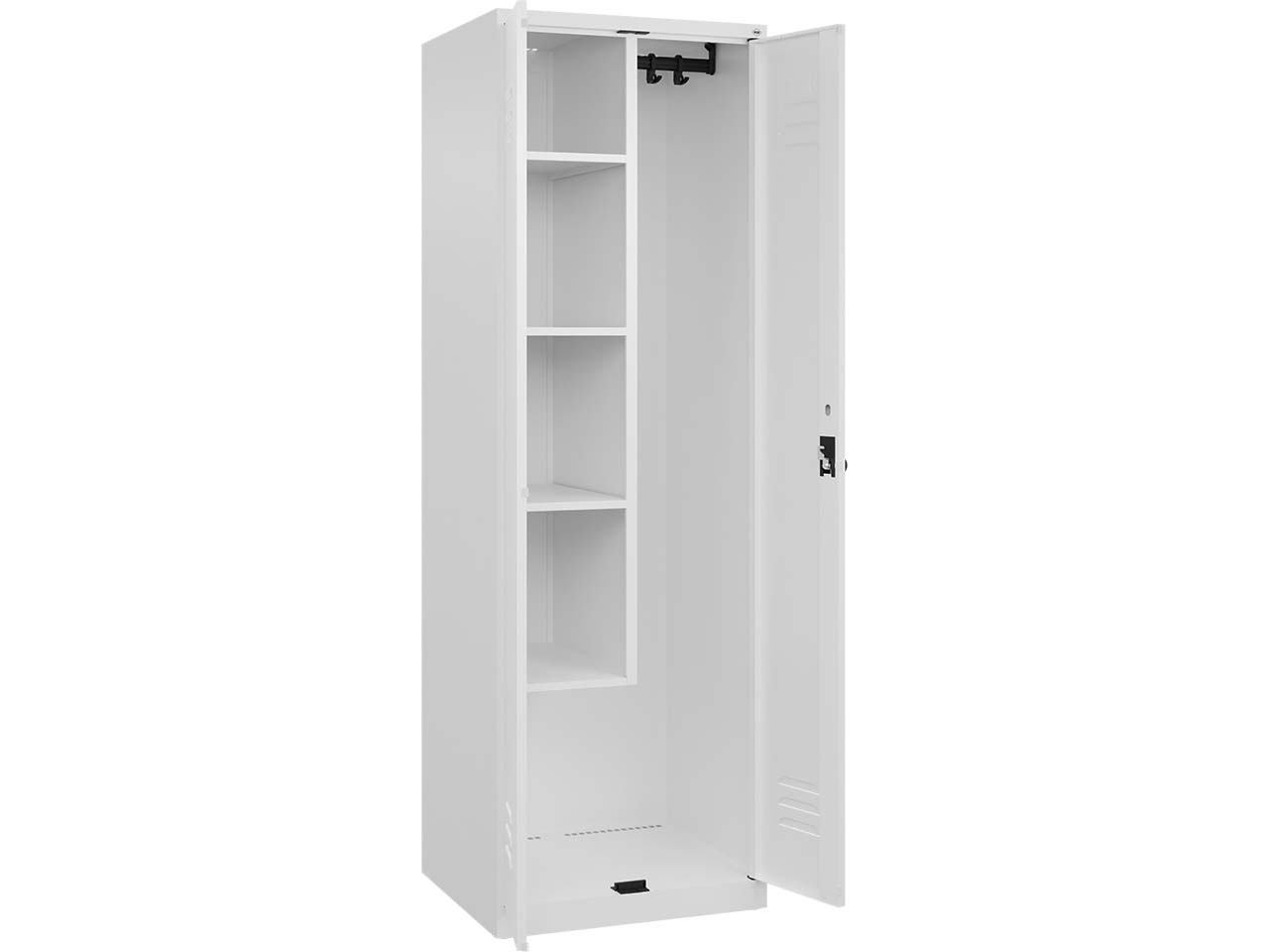 Der Putzmittel-Spind eignet sich für die ordentliche Unterbringung von Reinigungsmitteln, Eimern, etc. Der Korpus besteht aus einer stabilen Stahlkonstruktion mit einer hochwertigen Einbrennbeschichtung, die UV- und korrosionsbeständig ist. Innen verfügt der Spind über eine verkürzte Mitteltrennwand, vier Fachböden auf der linken Seite sowie einen Ablageboden und eine stabile Garderobenstange mit drei verdrehsicheren Doppel-Schiebehaken auf der rechten Seite. Die hinteren Belüftungsöffnungen sorgen für eine optimale Luftzirkulation. Die zueinander schlagenden Türen ermöglichen einen gemeinsamen Verschluss und sind mit Soft-Anschlag sowie geschlossenen Seitenprofilen ausgestattet, die für hohe Stabilität sorgen. Bodengleiter schützen sowohl den Schrank als auch den Boden. Ein ergonomischer Sicherheits-Drehriegel für Vorhängeschlösser sorgt für sicheren Verschluss. B 60 x T 50 x H 185 cm.
