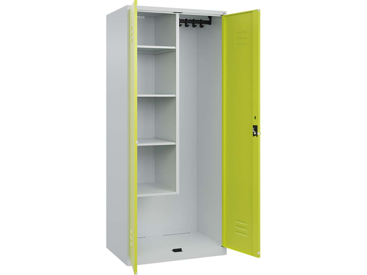 Der Putzmittel-Spind bietet eine durchdachte und platzsparende Lösung zur Aufbewahrung von Reinigungsutensilien wie Eimern, Flaschen und Zubehör. Gefertigt aus robustem Stahl und mit einer langlebigen, UV- und korrosionsbeständigen Einbrennbeschichtung versehen, ist er sowohl innen als auch außen optimal geschützt. Im Inneren überzeugt der Schrank durch eine praktische Mitteltrennwand, vier verstellbare Fachböden auf der linken Seite sowie eine Ablagefläche und eine stabile Garderobenstange mit vier verdrehsicheren Doppel-Schiebehaken rechts. Dank integrierter Belüftungsöffnungen bleibt die Luftzirkulation gewährleistet. Die Soft-Anschlagtüren mit geschlossenen Seitenprofilen bieten nicht nur Stabilität, sondern auch einen leisen und sanften Schließmechanismus. Bodengleiter schützen den Untergrund vor Kratzern, während ein ergonomischer Sicherheits-Drehriegel den sicheren Verschluss mit einem Vorhängeschloss ermöglicht. B 80 x T 50 x H 185 cm.