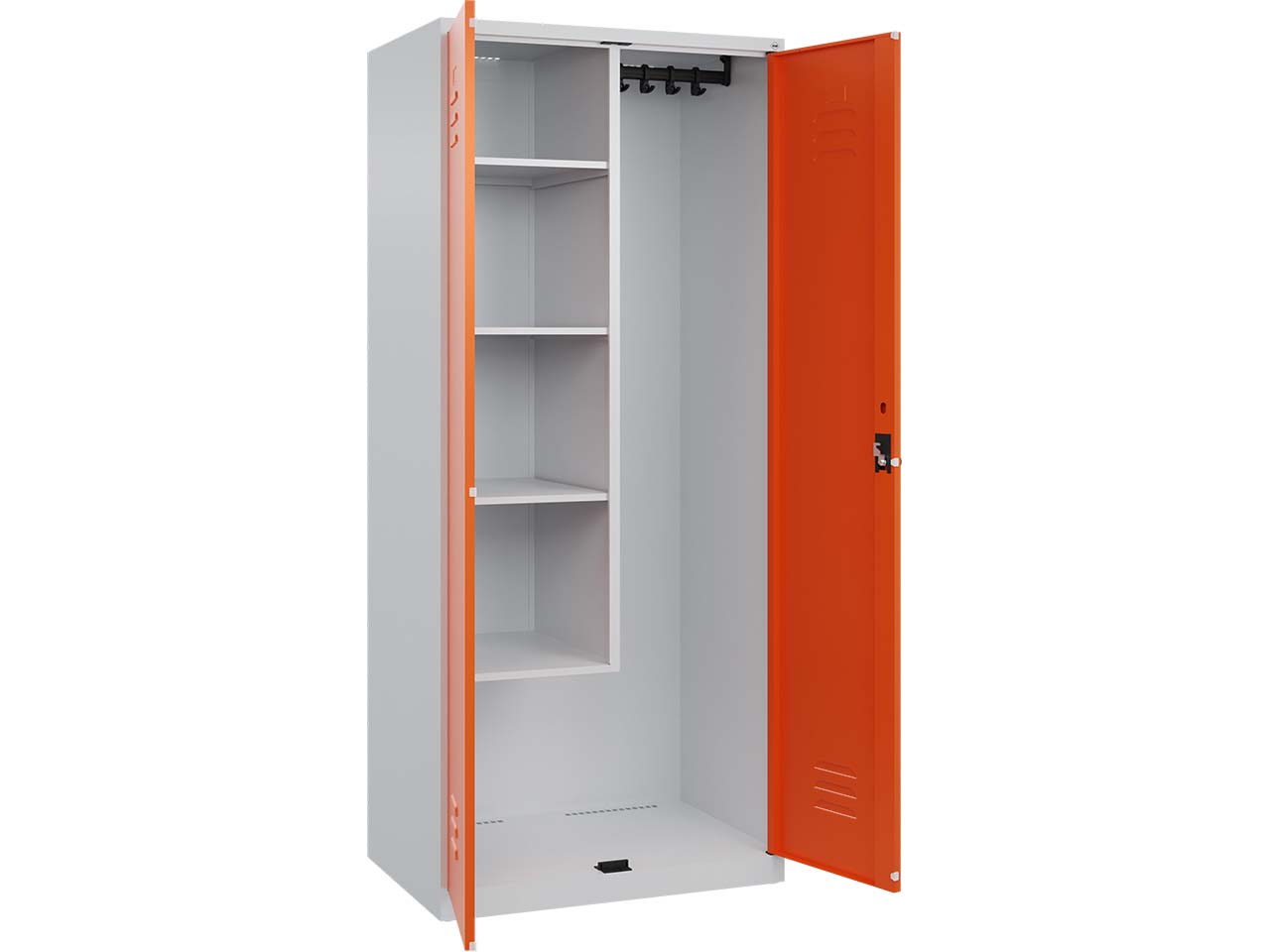 Der Putzmittel-Spind bietet eine durchdachte und platzsparende Lösung zur Aufbewahrung von Reinigungsutensilien wie Eimern, Flaschen und Zubehör. Gefertigt aus robustem Stahl und mit einer langlebigen, UV- und korrosionsbeständigen Einbrennbeschichtung versehen, ist er sowohl innen als auch außen optimal geschützt. Im Inneren überzeugt der Schrank durch eine praktische Mitteltrennwand, vier verstellbare Fachböden auf der linken Seite sowie eine Ablagefläche und eine stabile Garderobenstange mit vier verdrehsicheren Doppel-Schiebehaken rechts. Dank integrierter Belüftungsöffnungen bleibt die Luftzirkulation gewährleistet. Die Soft-Anschlagtüren mit geschlossenen Seitenprofilen bieten nicht nur Stabilität, sondern auch einen leisen und sanften Schließmechanismus. Bodengleiter schützen den Untergrund vor Kratzern, während ein ergonomischer Sicherheits-Drehriegel den sicheren Verschluss mit einem Vorhängeschloss ermöglicht. B 80 x T 50 x H 185 cm.