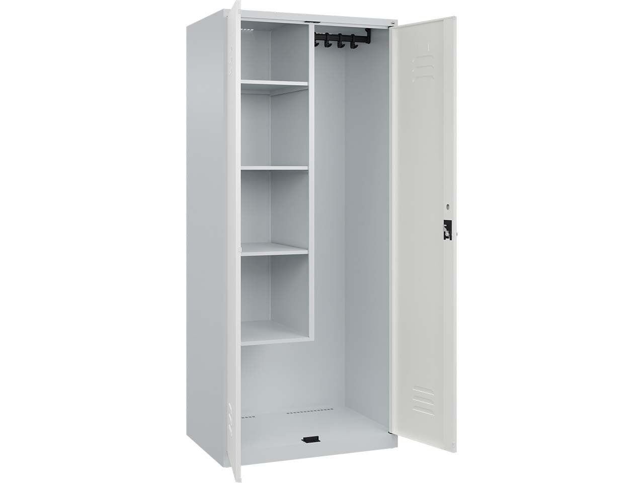 Der Putzmittel-Spind bietet eine durchdachte und platzsparende Lösung zur Aufbewahrung von Reinigungsutensilien wie Eimern, Flaschen und Zubehör. Gefertigt aus robustem Stahl und mit einer langlebigen, UV- und korrosionsbeständigen Einbrennbeschichtung versehen, ist er sowohl innen als auch außen optimal geschützt. Im Inneren überzeugt der Schrank durch eine praktische Mitteltrennwand, vier verstellbare Fachböden auf der linken Seite sowie eine Ablagefläche und eine stabile Garderobenstange mit vier verdrehsicheren Doppel-Schiebehaken rechts. Dank integrierter Belüftungsöffnungen bleibt die Luftzirkulation gewährleistet. Die Soft-Anschlagtüren mit geschlossenen Seitenprofilen bieten nicht nur Stabilität, sondern auch einen leisen und sanften Schließmechanismus. Bodengleiter schützen den Untergrund vor Kratzern, während ein ergonomischer Sicherheits-Drehriegel den sicheren Verschluss mit einem Vorhängeschloss ermöglicht. B 80 x T 50 x H 185 cm.