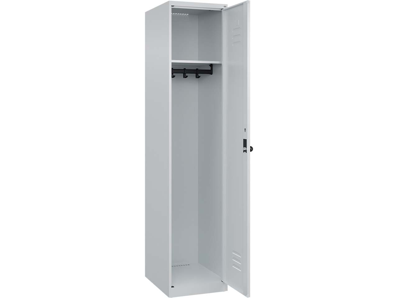 Der Spind ist eine zuverlässige und funktionale Lösung für die Aufbewahrung von Kleidung und persönlichen Gegenständen. Er bietet er ausreichend Platz und überzeugt durch eine langlebige Stahlkonstruktion, die dank einer hochwertigen Einbrennbeschichtung besonders resistent gegen UV-Strahlung und Korrosion ist. Im Inneren befindet sich ein praktischer Ablageboden sowie eine stabile Garderobenstange mit drei verdrehsicheren Doppel-Schiebehaken. Für zusätzlichen Schutz sind Bodengleiter angebracht, die sowohl den Schrank als auch den Boden vor Abnutzung bewahren. Mit Soft-Anschlag und geschlossenen Seitenprofilen für erhöhte Stabilität. Die Lüftungskiemen oben und unten gewährleisten eine effektive Luftzirkulation, während ein eingestanzter Etikettenrahmen die Beschriftung erleichtert. B 40 x T 50 x H 185 cm.
