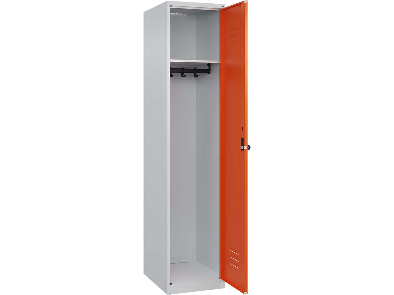 Der Spind ist eine zuverlässige und funktionale Lösung für die Aufbewahrung von Kleidung und persönlichen Gegenständen. Er bietet er ausreichend Platz und überzeugt durch eine langlebige Stahlkonstruktion, die dank einer hochwertigen Einbrennbeschichtung besonders resistent gegen UV-Strahlung und Korrosion ist. Im Inneren befindet sich ein praktischer Ablageboden sowie eine stabile Garderobenstange mit drei verdrehsicheren Doppel-Schiebehaken. Für zusätzlichen Schutz sind Bodengleiter angebracht, die sowohl den Schrank als auch den Boden vor Abnutzung bewahren. Mit Soft-Anschlag und geschlossenen Seitenprofilen für erhöhte Stabilität. Die Lüftungskiemen oben und unten gewährleisten eine effektive Luftzirkulation, während ein eingestanzter Etikettenrahmen die Beschriftung erleichtert. B 40 x T 50 x H 185 cm.