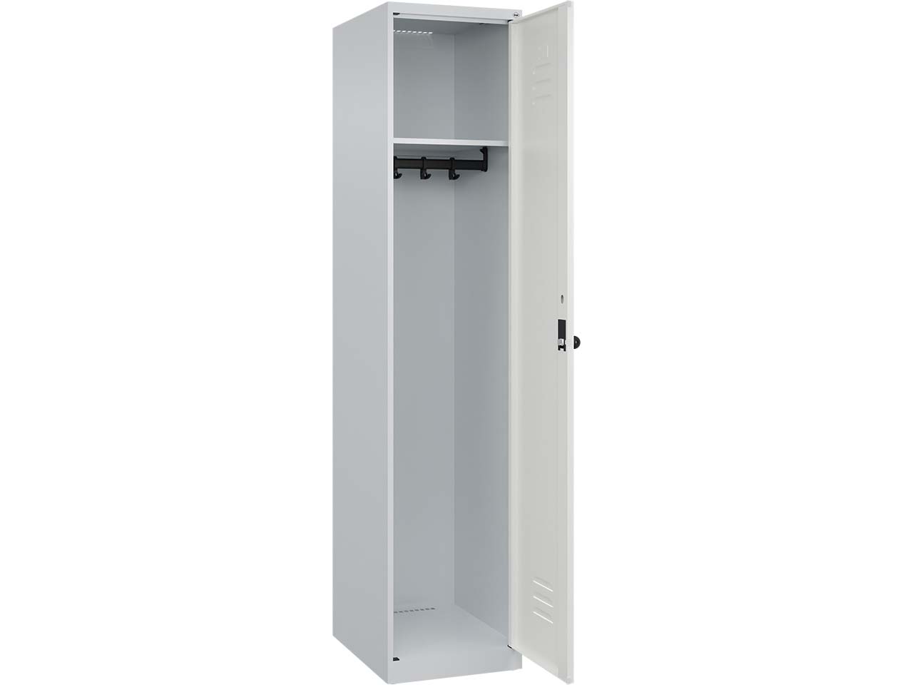 Der Spind ist eine zuverlässige und funktionale Lösung für die Aufbewahrung von Kleidung und persönlichen Gegenständen. Er bietet er ausreichend Platz und überzeugt durch eine langlebige Stahlkonstruktion, die dank einer hochwertigen Einbrennbeschichtung besonders resistent gegen UV-Strahlung und Korrosion ist. Im Inneren befindet sich ein praktischer Ablageboden sowie eine stabile Garderobenstange mit drei verdrehsicheren Doppel-Schiebehaken. Für zusätzlichen Schutz sind Bodengleiter angebracht, die sowohl den Schrank als auch den Boden vor Abnutzung bewahren. Mit Soft-Anschlag und geschlossenen Seitenprofilen für erhöhte Stabilität. Die Lüftungskiemen oben und unten gewährleisten eine effektive Luftzirkulation, während ein eingestanzter Etikettenrahmen die Beschriftung erleichtert. B 40 x T 50 x H 185 cm.