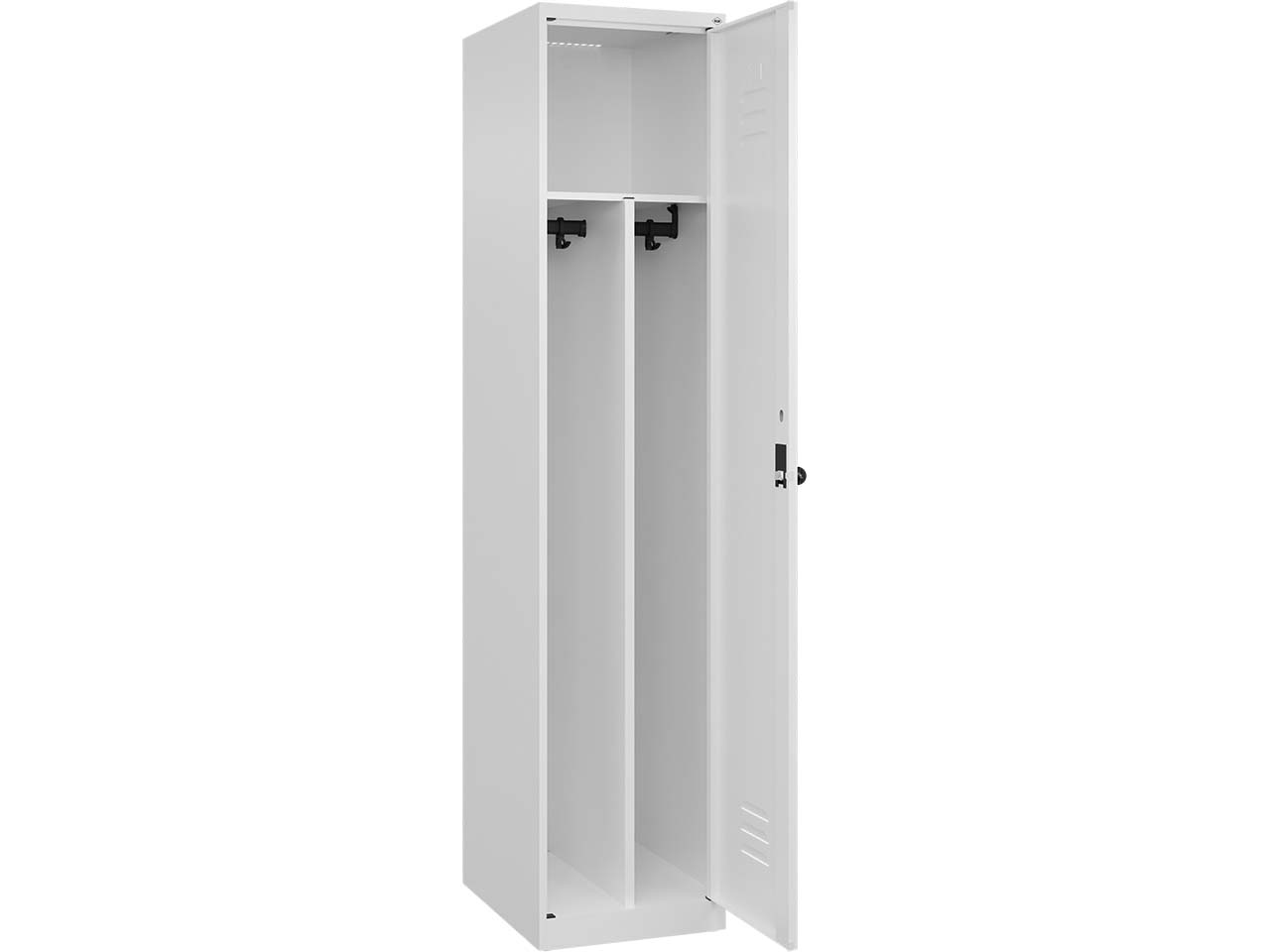 Der Spind aus robustem Stahl verfügt über ein Abteil und eignet sich dank der Mitteltrennwand hervorragend, um Privat- und Arbeitskleidung sicher und separat aufzubewahren. Der Korpus ist mit hinteren Belüftungsöffnungen im oberen und unteren Bereich ausgestattet, um eine optimale Luftzirkulation zu ermöglichen. Garderobenstangen mit zwei verdrehsicheren Doppel-Schiebehaken ermöglichen es, Kleidungsstücke aufzuhängen. Die Tür schließt mit Soft-Anschlag und verfügt über geschlossene Seitenprofile, die die Stabilität erhöhen. Verschlossen wird der Spind über einen ergonomischen Sicherheits-Drehriegel, der für die Nutzung mit einem Vorhängeschloss konzipiert ist. B 40 x T 50 x H 185 cm.