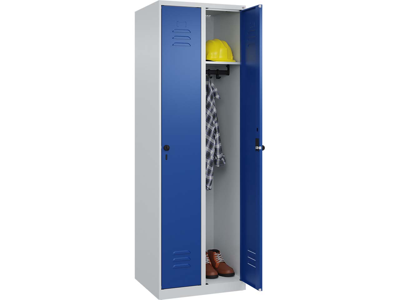 Der Spind mit zwei Abteilen bietet eine robuste und langlebige Lösung für eine ordentliche Aufbewahrung. Der Korpus besteht aus einer stabilen Stahlkonstruktion, die mit einer hochwertigen Einbrennbeschichtung versehen ist. Diese sorgt nicht nur für hohe UV- und Korrosionsbeständigkeit, sondern auch für eine lange Lebensdauer. Für eine optimale Belüftung des Inhalts sind hinten Belüftungsöffnungen im oberen und unteren Bereich integriert. Jedes der beiden Abteile ist im Inneren mit einem praktischen Ablageboden ausgestattet. Darunter befindet sich eine stabile Garderobenstange mit drei verdrehsicheren Doppel-Schiebehaken Bodengleiter am unteren Ende des Spinds schützen sowohl den Schrank als auch den Fußboden vor Kratzern und Beschädigungen. Die Tüten verfügen über eine Soft-Anschlag-Funktion. Zum sicheren Verschließen der Abteile sind zwei ergonomische Sicherheits-Drehriegel vorgesehen, die für die Verwendung mit Vorhängeschlössern geeignet sind. B 60 x T 50 x H 185 cm.