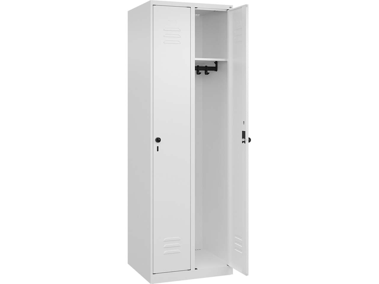 Der Spind mit zwei Abteilen bietet eine robuste und langlebige Lösung für eine ordentliche Aufbewahrung. Der Korpus besteht aus einer stabilen Stahlkonstruktion, die mit einer hochwertigen Einbrennbeschichtung versehen ist. Diese sorgt nicht nur für hohe UV- und Korrosionsbeständigkeit, sondern auch für eine lange Lebensdauer. Für eine optimale Belüftung des Inhalts sind hinten Belüftungsöffnungen im oberen und unteren Bereich integriert. Jedes der beiden Abteile ist im Inneren mit einem praktischen Ablageboden ausgestattet. Darunter befindet sich eine stabile Garderobenstange mit drei verdrehsicheren Doppel-Schiebehaken Bodengleiter am unteren Ende des Spinds schützen sowohl den Schrank als auch den Fußboden vor Kratzern und Beschädigungen. Die Tüten verfügen über eine Soft-Anschlag-Funktion. Zum sicheren Verschließen der Abteile sind zwei ergonomische Sicherheits-Drehriegel vorgesehen, die für die Verwendung mit Vorhängeschlössern geeignet sind. B 60 x T 50 x H 185 cm.
