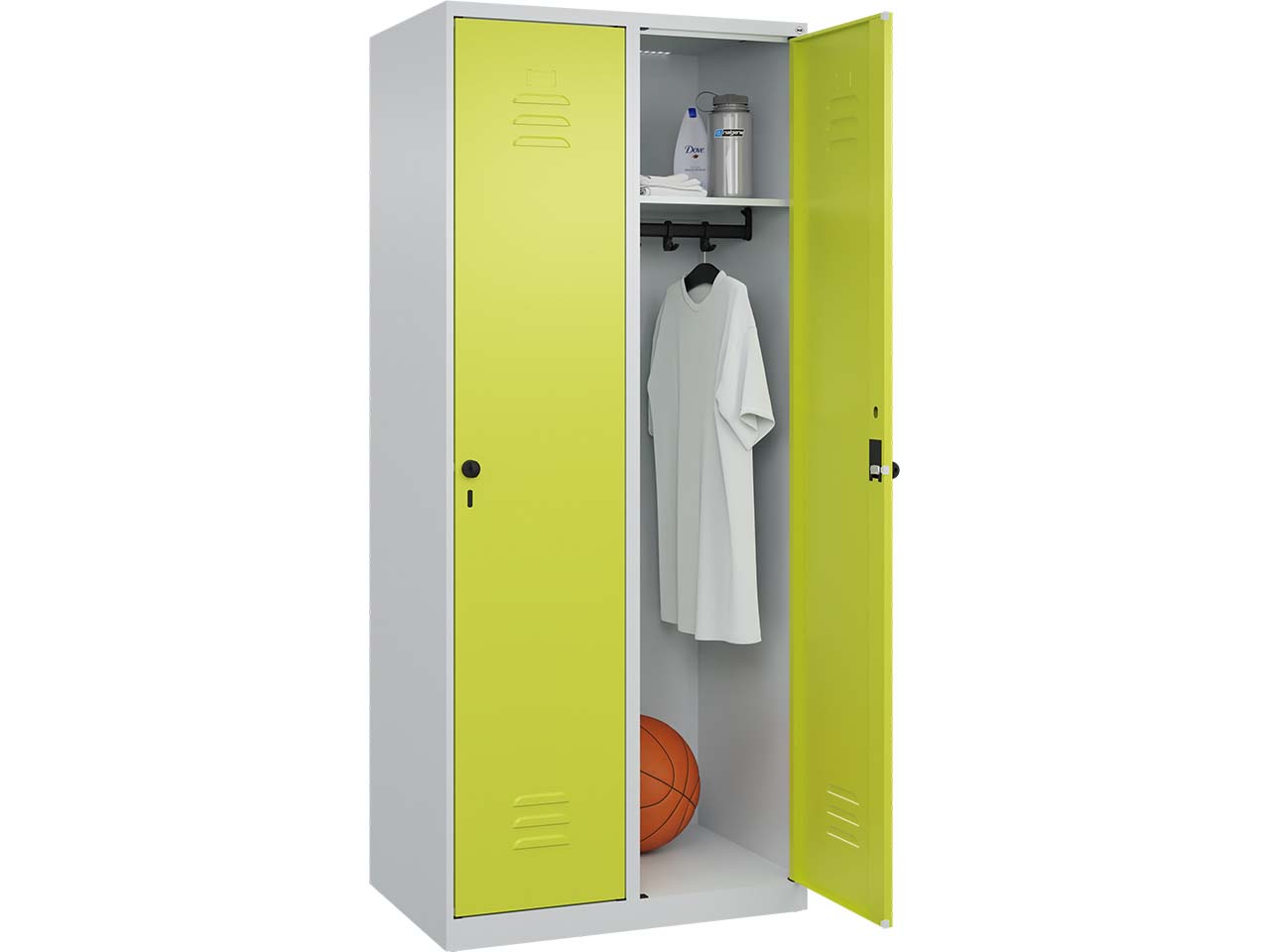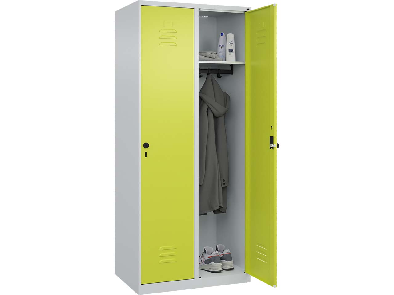 Der Spind mit zwei Abteilen bietet eine stabile und langlebige Aufbewahrungslösung. Der Korpus besteht aus einer robusten Stahlkonstruktion mit hochwertiger Einbrennbeschichtung, die sowohl UV- als auch korrosionsbeständig ist. Für optimale Belüftung sorgen Öffnungen im oberen und unteren Bereich. Jedes Abteil ist mit einem Ablageboden und einer stabilen Garderobenstange ausgestattet, die mit drei verdrehsicheren Doppel-Schiebehaken versehen ist. Die Türen, die sich bis zu 110 Grad öffnen lassen, sind aus Stahl gefertigt und verfügen über einen Soft-Anschlag sowie Lüftungsschlitze. Der Schrank ist mit Bodengleitern ausgestattet und wird über ergonomische Sicherheits-Drehriegel für Vorhängeschlösser gesichert. B 80 x T 50 x H 185 cm.
