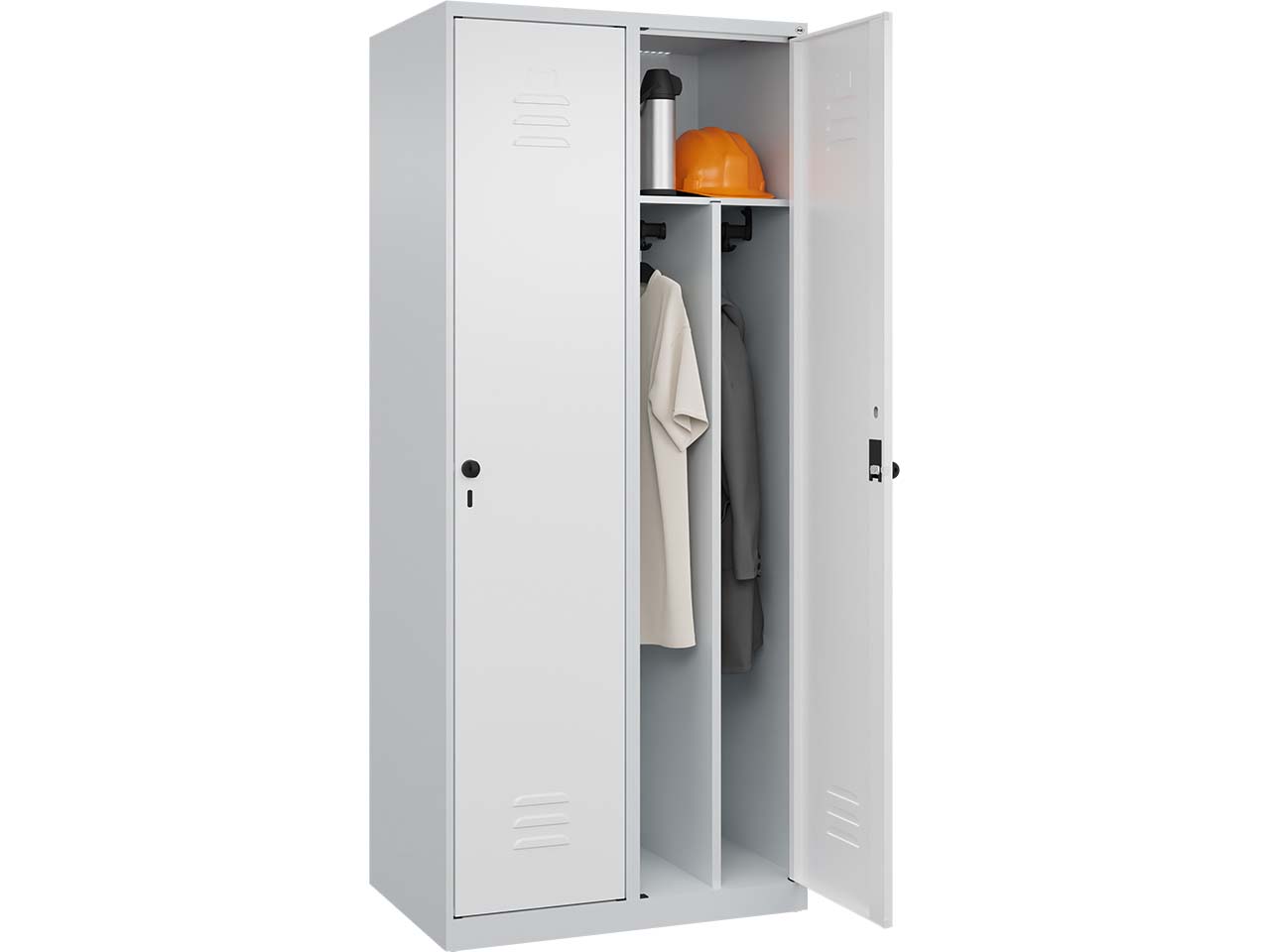 Der Spind bietet zwei Abteile und eignet sich ideal als raumsparende Lösung, um Privat- und Berufskleidung zu trennen. Sein Korpus aus robuster Stahlkonstruktion ist mit einer UV- und korrosionsbeständigen Einbrennbeschichtung versehen. Jedes Abteil verfügt über einen Ablageboden, eine Mitteltrennwand und links sowie rechts eine stabile Garderobenstange mit verdrehsicheren Doppel-Schiebehaken. Für optimale Luftzirkulation sorgen Belüftungsöffnungen oben und unten. Die Stahl-Türen sind rechts angeschlagen, lassen sich bis zu 110 Grad öffnen, verfügen über Soft-Anschlag und bieten dank geschlossenen Seitenprofilen hohe Stabilität. Bodengleiter schützen sowohl den Schrank als auch den Boden und zwei ergonomische Sicherheits-Drehriegel ermöglichen die Verwendung von Vorhängeschlössern. B 80 x T 50 x H 185 cm.