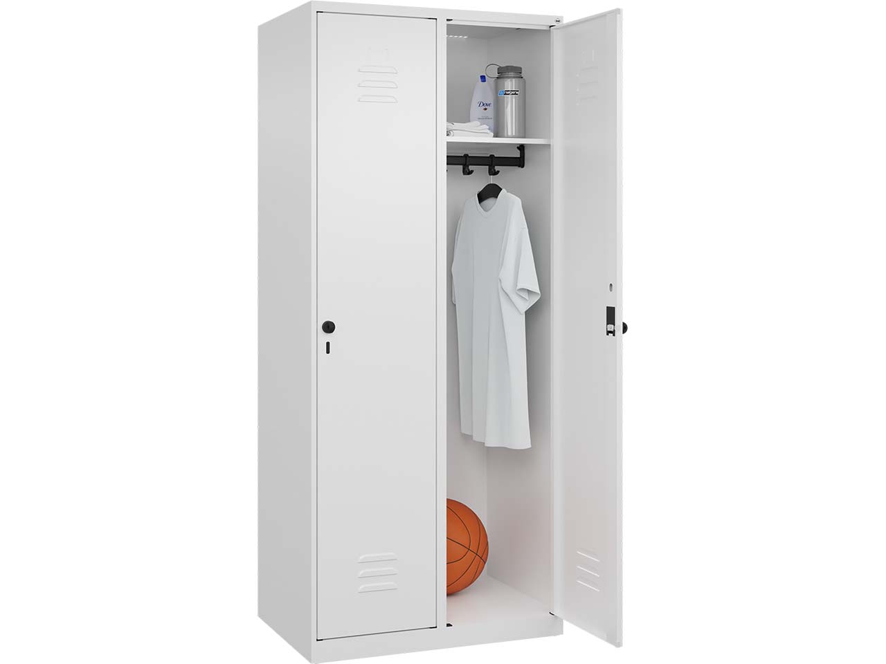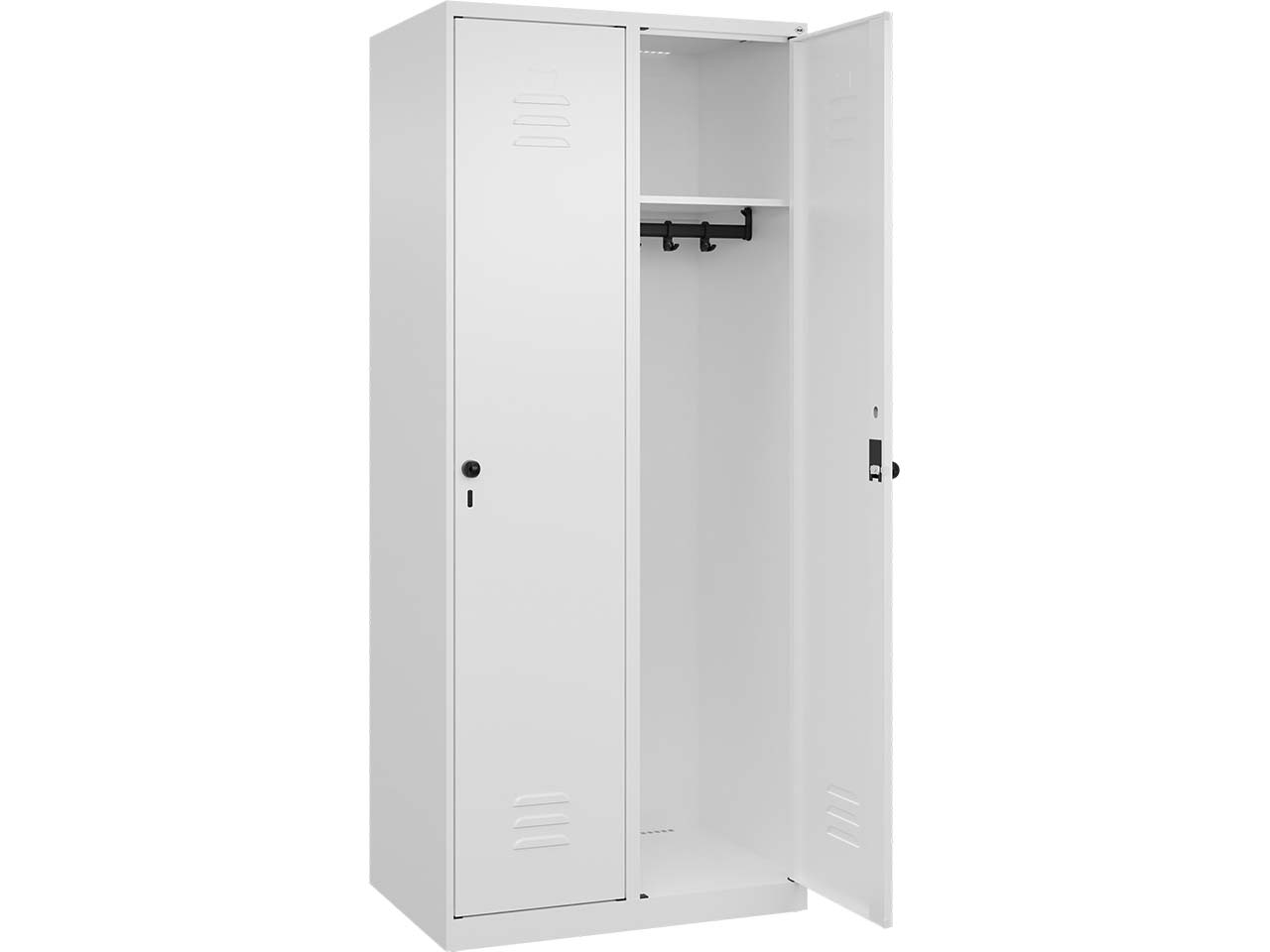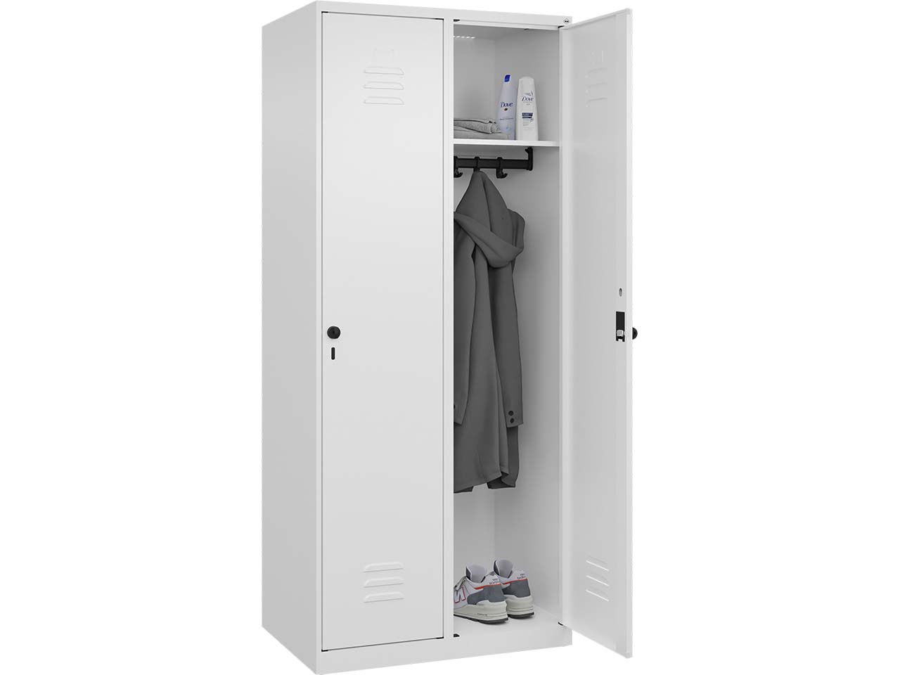 Der Spind mit zwei Abteilen bietet eine stabile und langlebige Aufbewahrungslösung. Der Korpus besteht aus einer robusten Stahlkonstruktion mit hochwertiger Einbrennbeschichtung, die sowohl UV- als auch korrosionsbeständig ist. Für optimale Belüftung sorgen Öffnungen im oberen und unteren Bereich. Jedes Abteil ist mit einem Ablageboden und einer stabilen Garderobenstange ausgestattet, die mit drei verdrehsicheren Doppel-Schiebehaken versehen ist. Die Türen, die sich bis zu 110 Grad öffnen lassen, sind aus Stahl gefertigt und verfügen über einen Soft-Anschlag sowie Lüftungsschlitze. Der Schrank ist mit Bodengleitern ausgestattet und wird über ergonomische Sicherheits-Drehriegel für Vorhängeschlösser gesichert. B 80 x T 50 x H 185 cm.