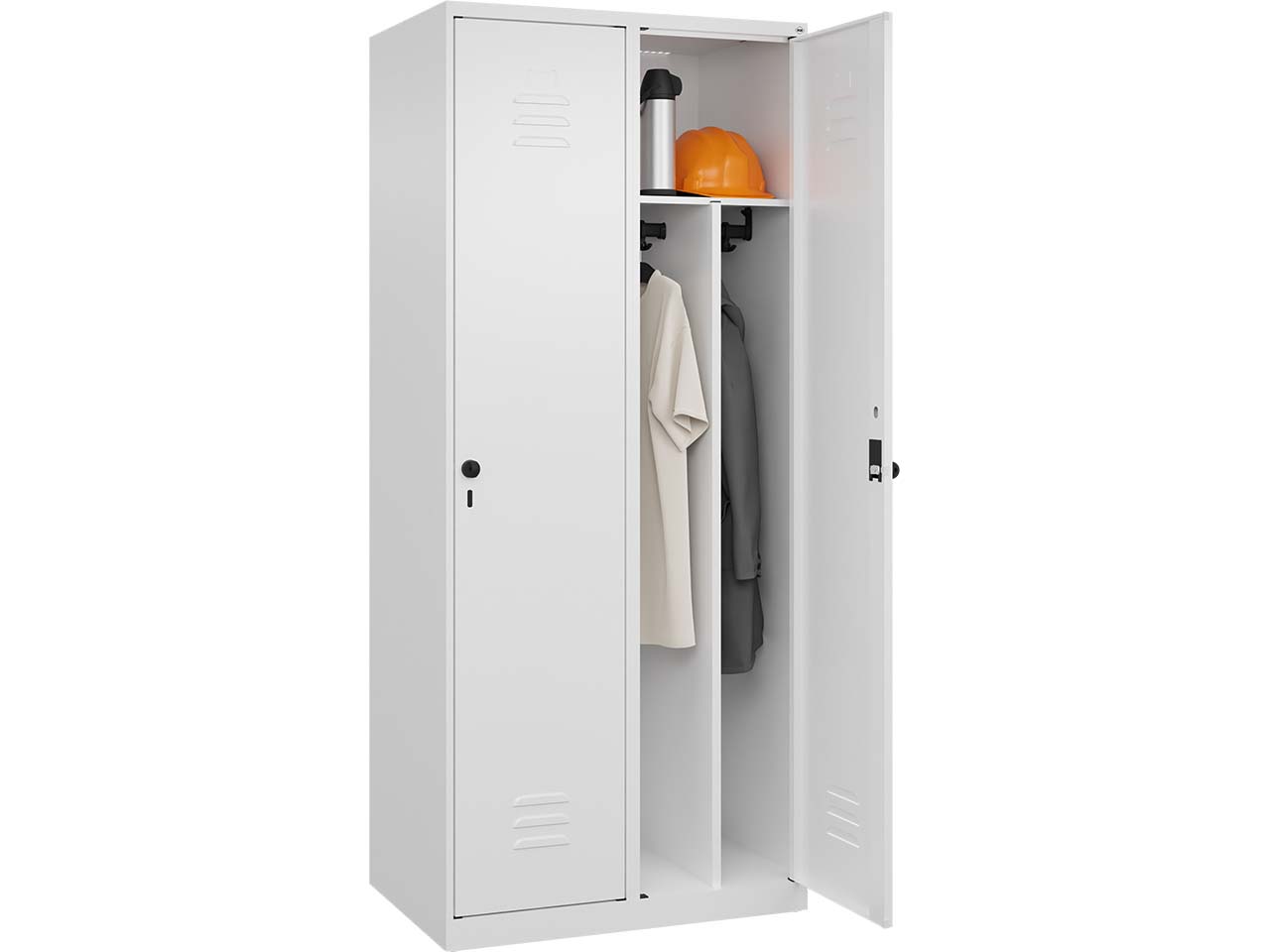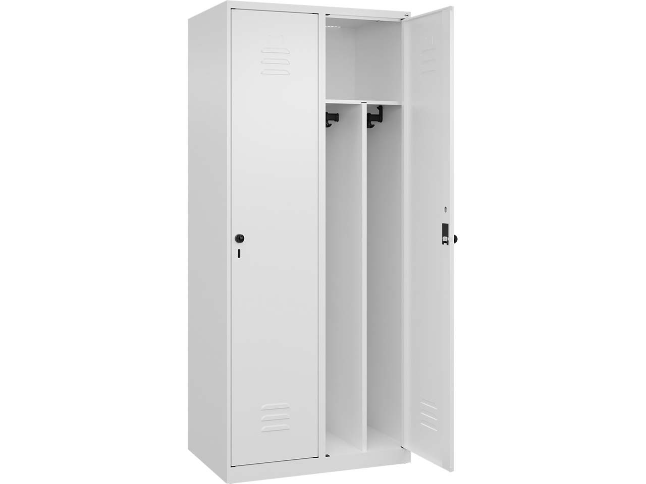 Der Spind bietet zwei Abteile und eignet sich ideal als raumsparende Lösung, um Privat- und Berufskleidung zu trennen. Sein Korpus aus robuster Stahlkonstruktion ist mit einer UV- und korrosionsbeständigen Einbrennbeschichtung versehen. Jedes Abteil verfügt über einen Ablageboden, eine Mitteltrennwand und links sowie rechts eine stabile Garderobenstange mit verdrehsicheren Doppel-Schiebehaken. Für optimale Luftzirkulation sorgen Belüftungsöffnungen oben und unten. Die Stahl-Türen sind rechts angeschlagen, lassen sich bis zu 110 Grad öffnen, verfügen über Soft-Anschlag und bieten dank geschlossenen Seitenprofilen hohe Stabilität. Bodengleiter schützen sowohl den Schrank als auch den Boden und zwei ergonomische Sicherheits-Drehriegel ermöglichen die Verwendung von Vorhängeschlössern. B 80 x T 50 x H 185 cm.