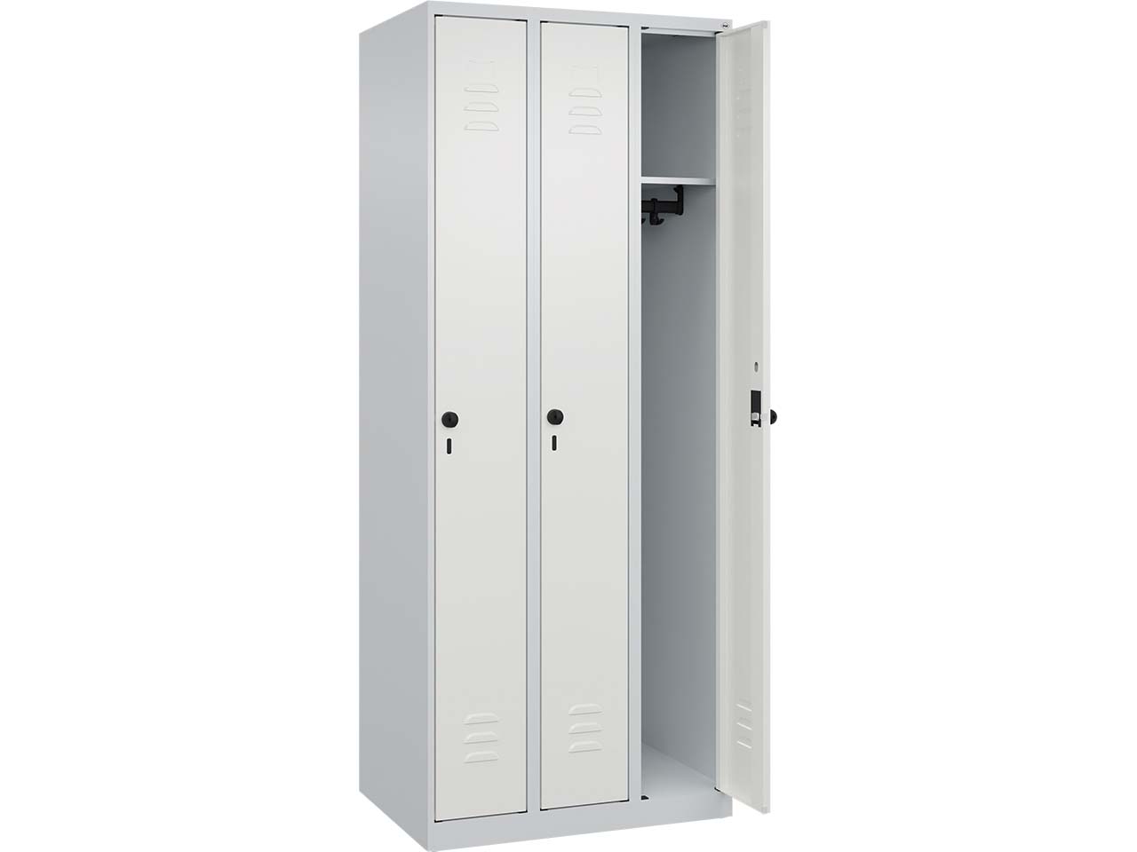 Der Spind verfügt über drei Abteile mit einer Breite von jeweils 25 cm und eignet sich hervorragend als stabile, langlebige Aufbewahrungslösung für persönliche Gegenstände. Der Korpus besteht aus einer robusten Stahlkonstruktion mit hochwertiger Einbrennbeschichtung, die sowohl UV- als auch korrosionsbeständig ist. Für optimale Belüftung sorgen Öffnungen im oberen und unteren Bereich. Jedes Abteil ist mit einem Ablageboden und einer stabilen Garderobenstange ausgestattet, die mit drei verdrehsicheren Doppel-Schiebehaken versehen ist. Die Türen, die sich bis zu 110 Grad öffnen lassen, sind aus Stahl gefertigt und verfügen über einen Soft-Anschlag sowie Lüftungsschlitze. Der Schrank ist mit Bodengleitern ausgestattet und wird über ergonomische Sicherheits-Drehriegel für Vorhängeschlösser gesichert. B 75 x T 50 x H 185 cm.