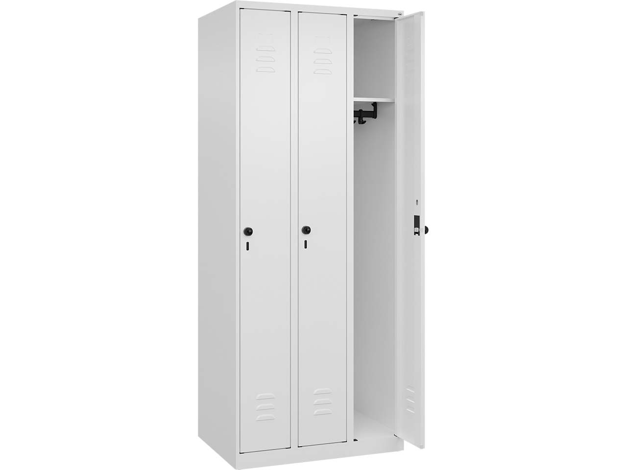 Der Spind verfügt über drei Abteile mit einer Breite von jeweils 25 cm und eignet sich hervorragend als stabile, langlebige Aufbewahrungslösung für persönliche Gegenstände. Der Korpus besteht aus einer robusten Stahlkonstruktion mit hochwertiger Einbrennbeschichtung, die sowohl UV- als auch korrosionsbeständig ist. Für optimale Belüftung sorgen Öffnungen im oberen und unteren Bereich. Jedes Abteil ist mit einem Ablageboden und einer stabilen Garderobenstange ausgestattet, die mit drei verdrehsicheren Doppel-Schiebehaken versehen ist. Die Türen, die sich bis zu 110 Grad öffnen lassen, sind aus Stahl gefertigt und verfügen über einen Soft-Anschlag sowie Lüftungsschlitze. Der Schrank ist mit Bodengleitern ausgestattet und wird über ergonomische Sicherheits-Drehriegel für Vorhängeschlösser gesichert. B 75 x T 50 x H 185 cm.